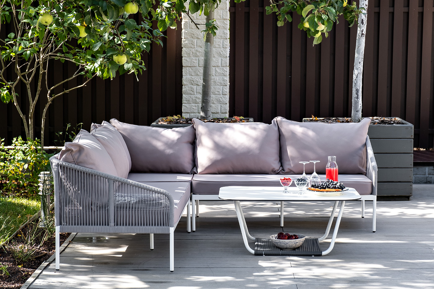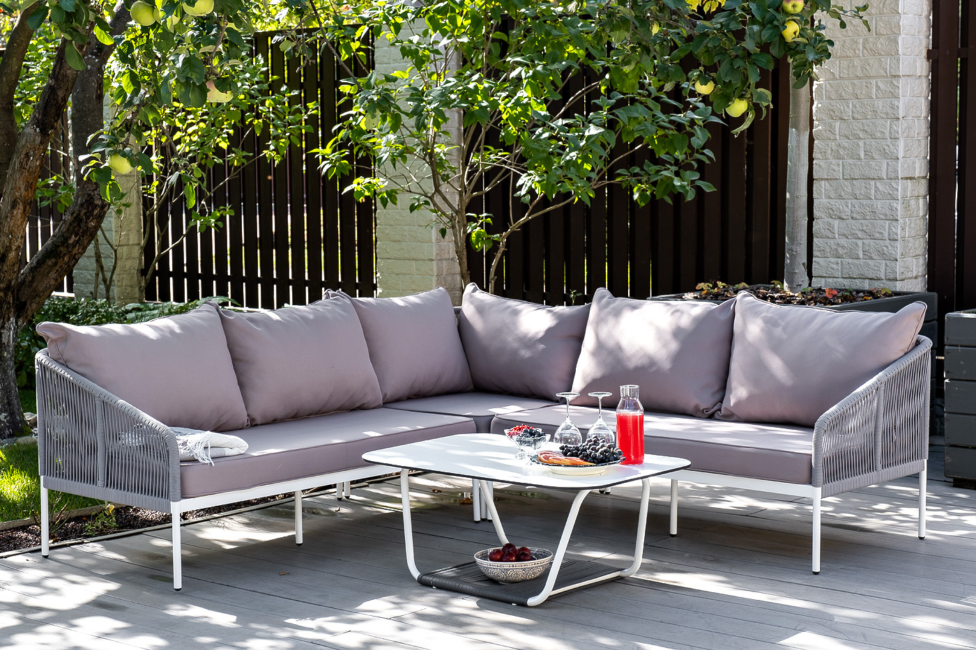 Диван идет в комплекте с мягкими подушками в чехлах светло-серого цвета. "Канны" правый модуль плетеный из роупа, каркас алюминий белый шагрень, роуп светло-серый круглый, ткань светло-серая 1шт. 1 480Х850Х750, "Канны" левый модуль плетеный из роупа, каркас алюминий белый шагрень, роуп светло-серый круглый, ткань светло-серая 1шт. 1 480Х850Х750, "Канны" угловой модуль плетеный из роупа, каркас алюминий белый шагрень, роуп светло-серый круглый, ткань светло-серая 1шт. 850Х850Х750, "Гранада" журнальный стол 90х60см из HPL, цвет "молочный", каркас белый муар, роуп темно-серый круглый 1шт. 900Х600Х420,