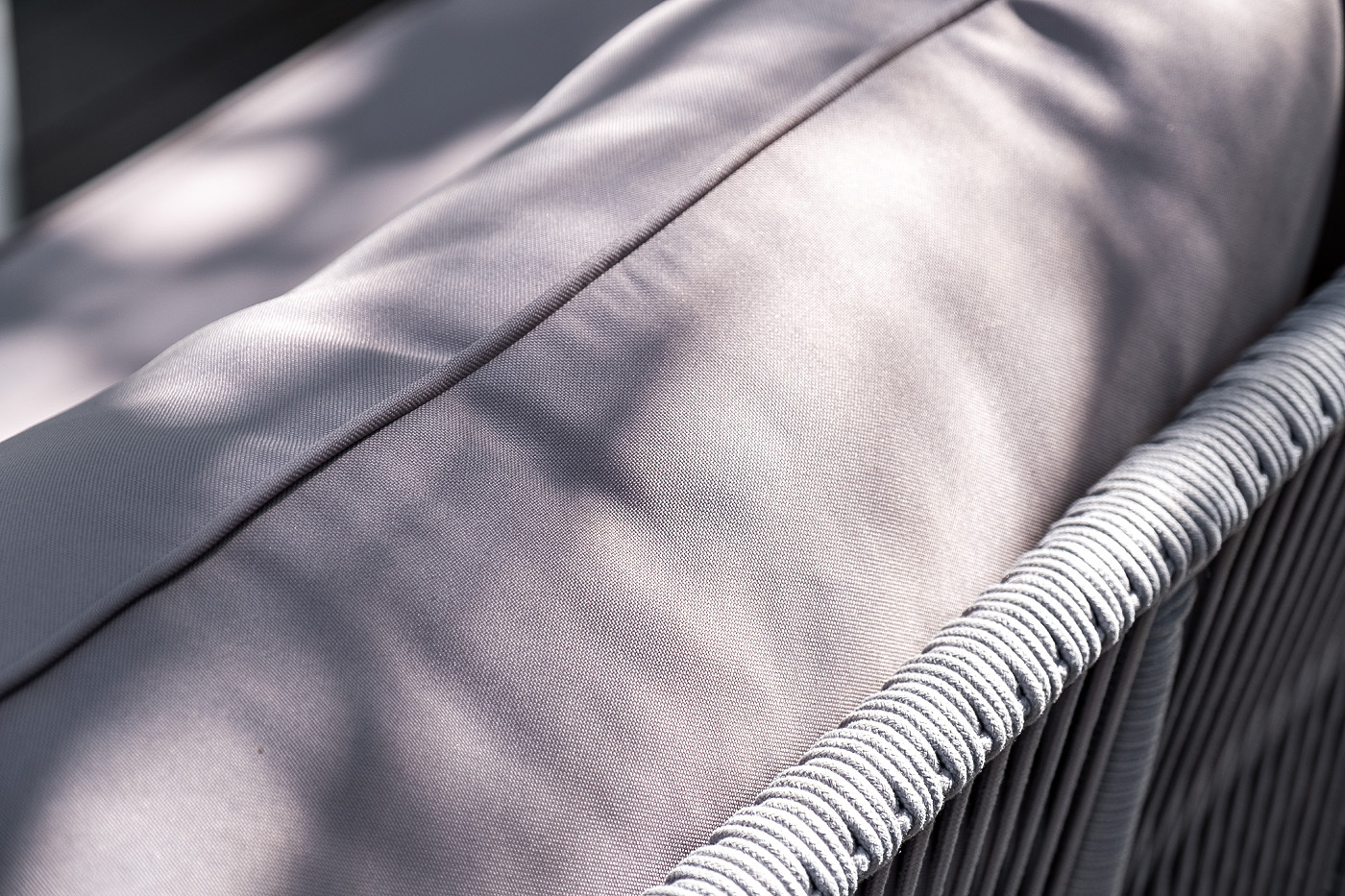Каркас уличной мебели выполнен из износостойкого алюминия. Его дополняет светло-серая ручная оплетка, изготовленная на основе эластичных синтетических лент из полиэфирных волокон высокой прочности (роупа).