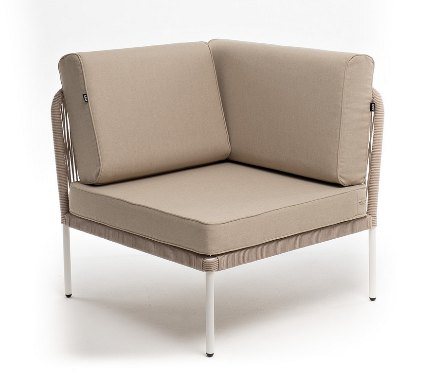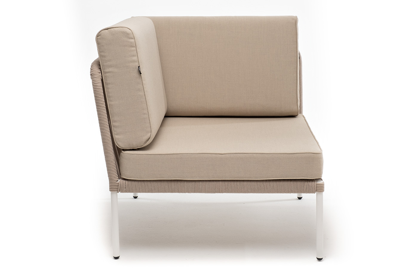 Плетеный модуль имеет алюминиевый каркас, окрашенный порошковой краской в белый цвет. Боковины каркаса вручную оплетены роупом - эластичными синтетическими лентами, изготовленными из высокопрочных полиэфирных волокон. Цвет оплетки - бежевый.