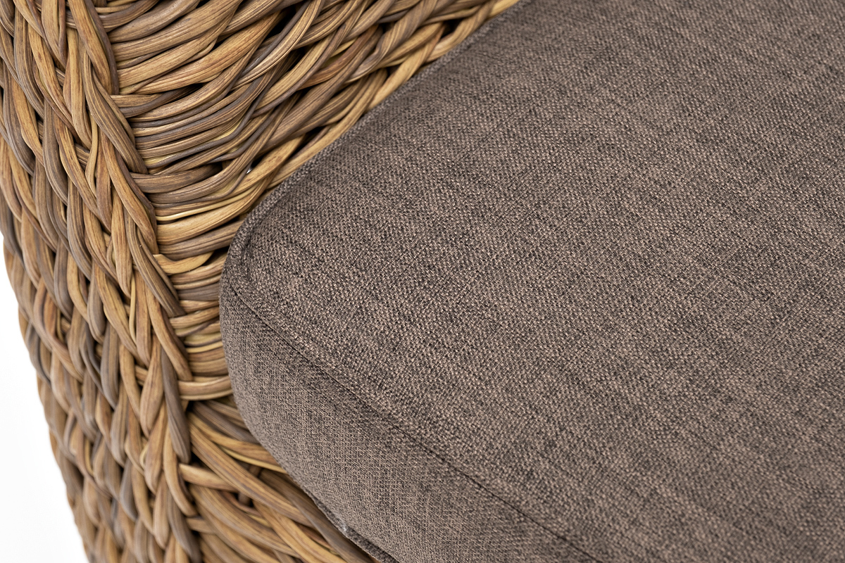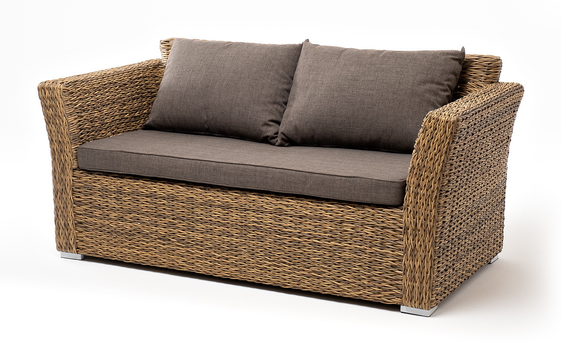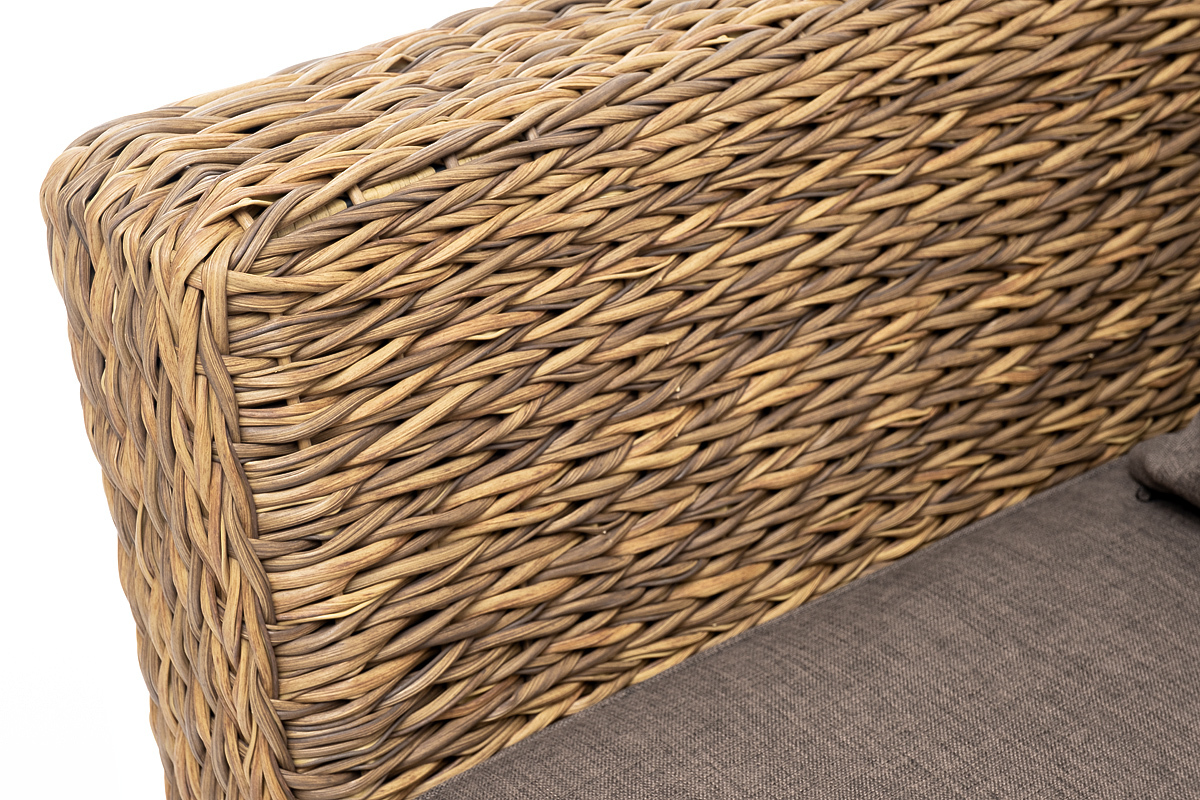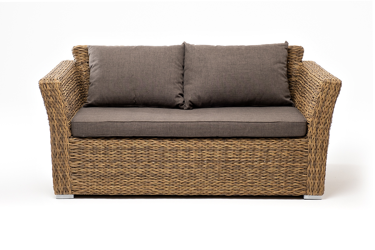 Диван выполнен из искусственного ротанга вида «гиацинт» соломенного цвета, оплетенного вручную.