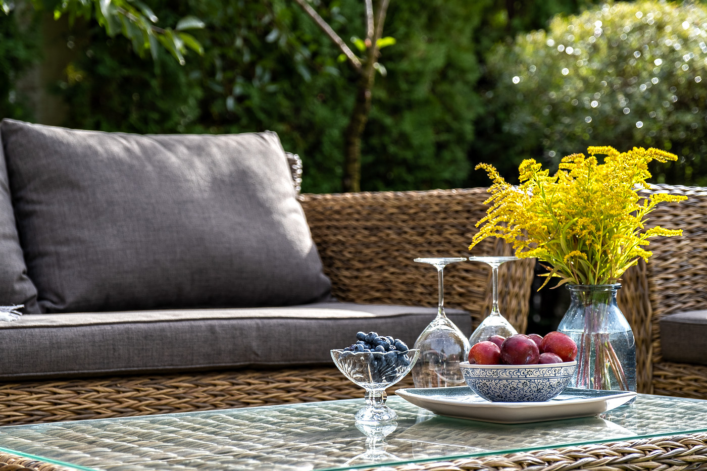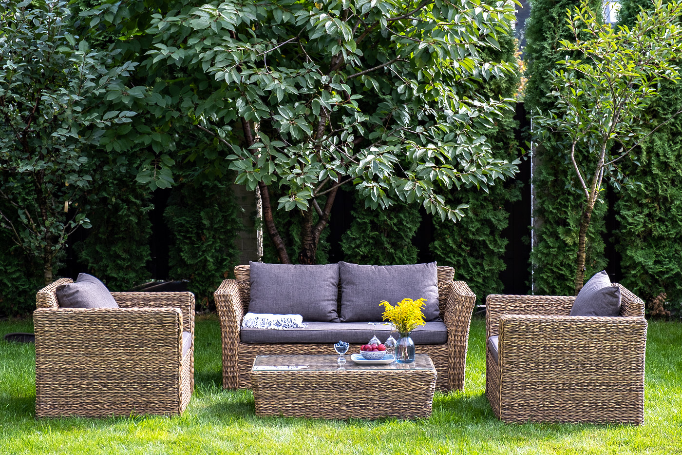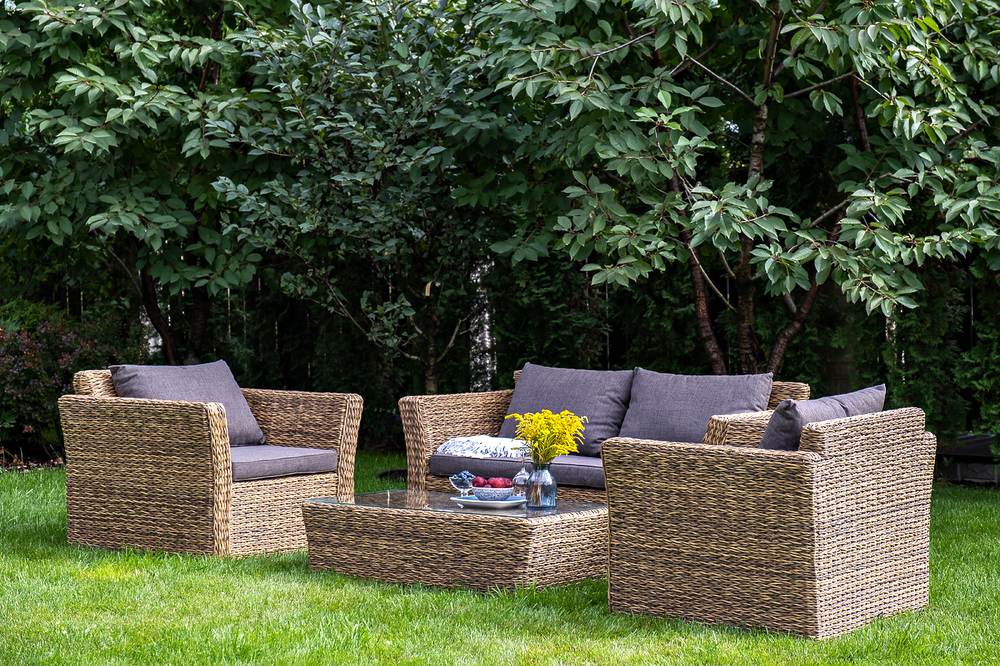 Двухместный диван дополнен несколькими подушками со съёмными чехлами серого цвета. Они изготовлены из прочного полиэстера, плотность которого достигает 300гр/м2. Предусмотрена влагоотталкивающая пропитка ткани для защиты текстильных изделий от намокания.