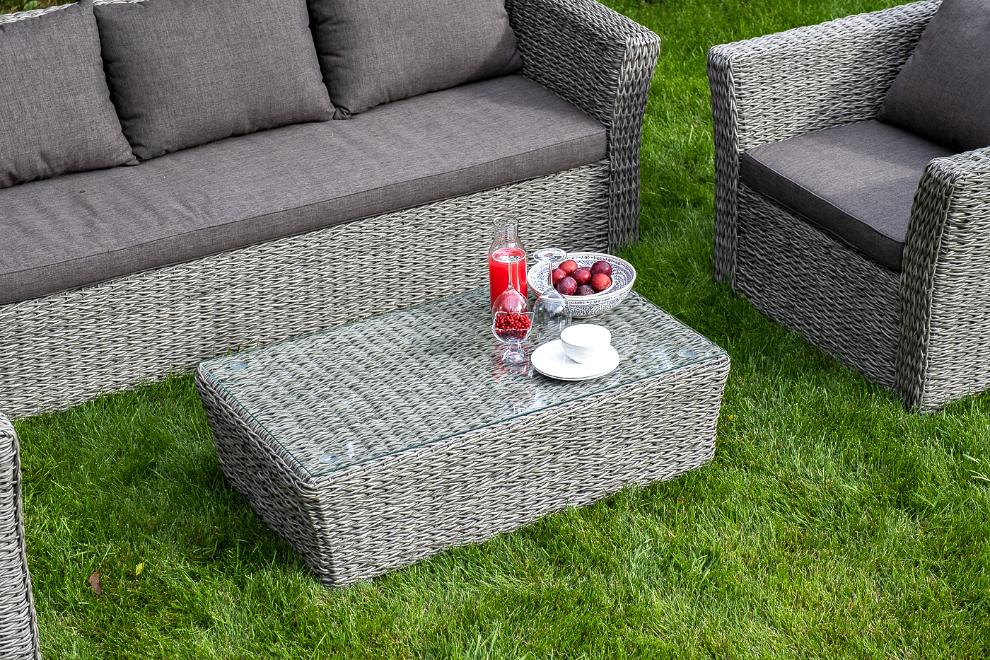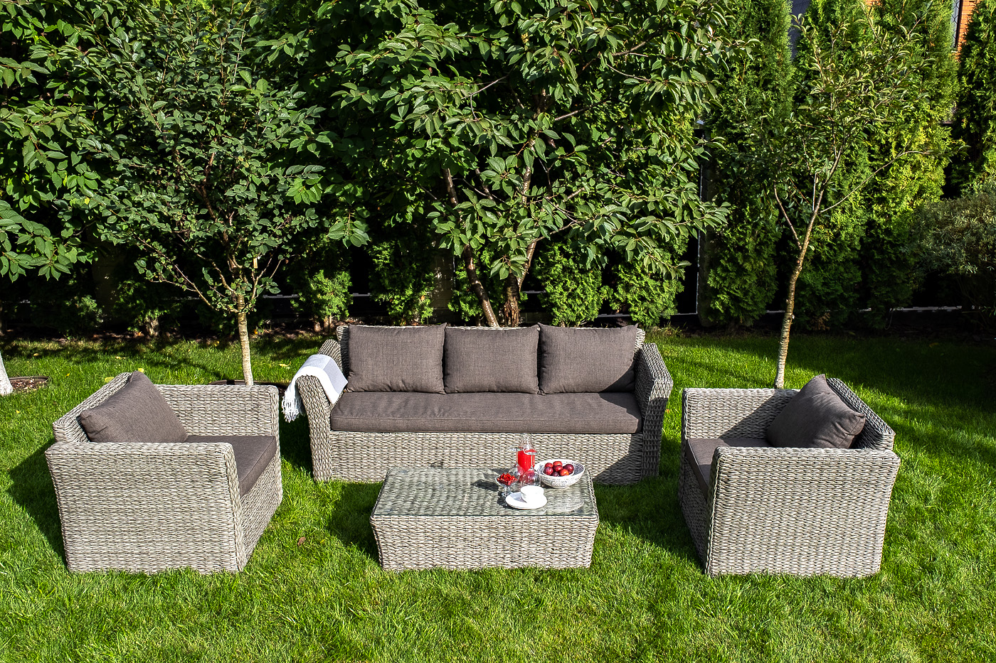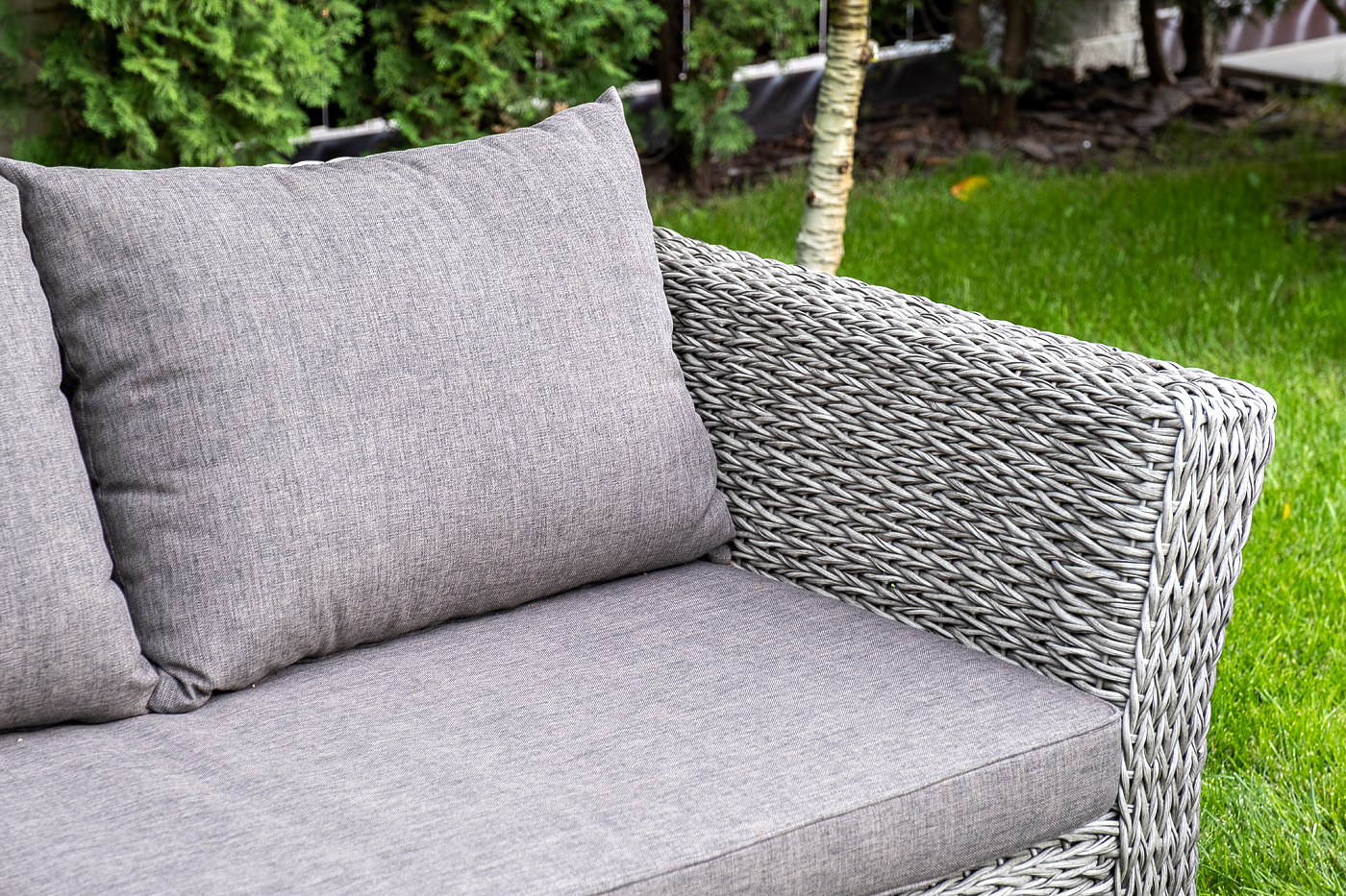 Из алюминия сделан устойчивый каркас мебели. Ее поверхность дополнена искусственным ротангом вида "гиацинт", из которого сделано ручное плетение серого цвета.