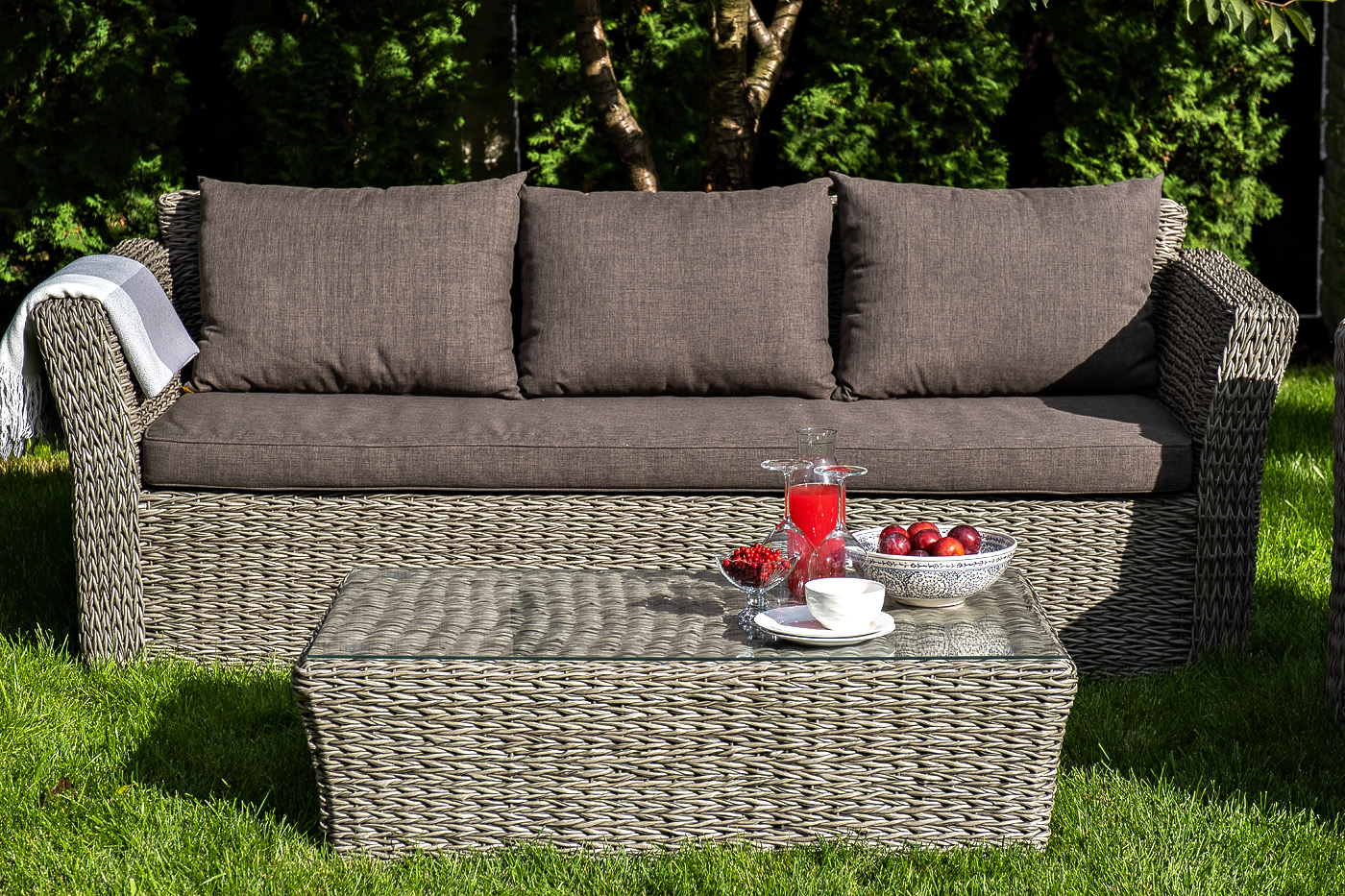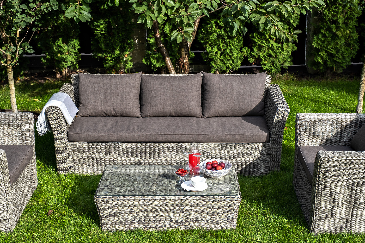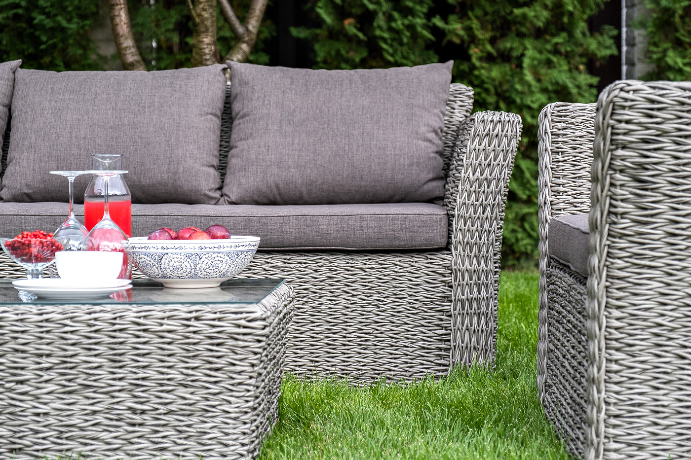Из алюминия сделан устойчивый каркас мебели. Ее поверхность дополнена искусственным ротангом вида "гиацинт", из которого сделано ручное плетение серого цвета.
