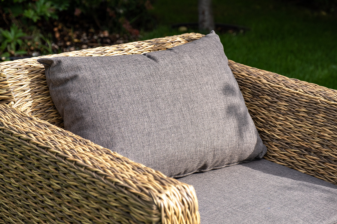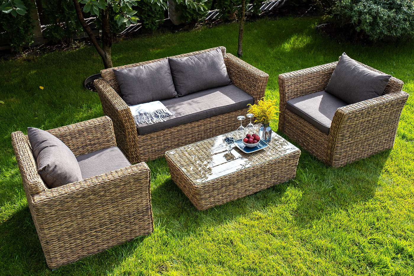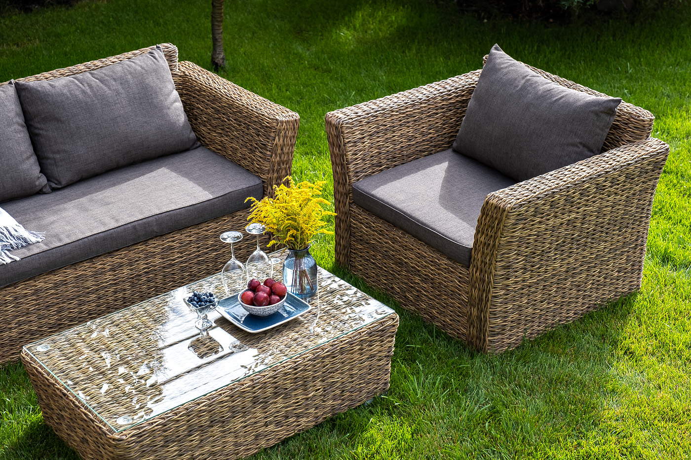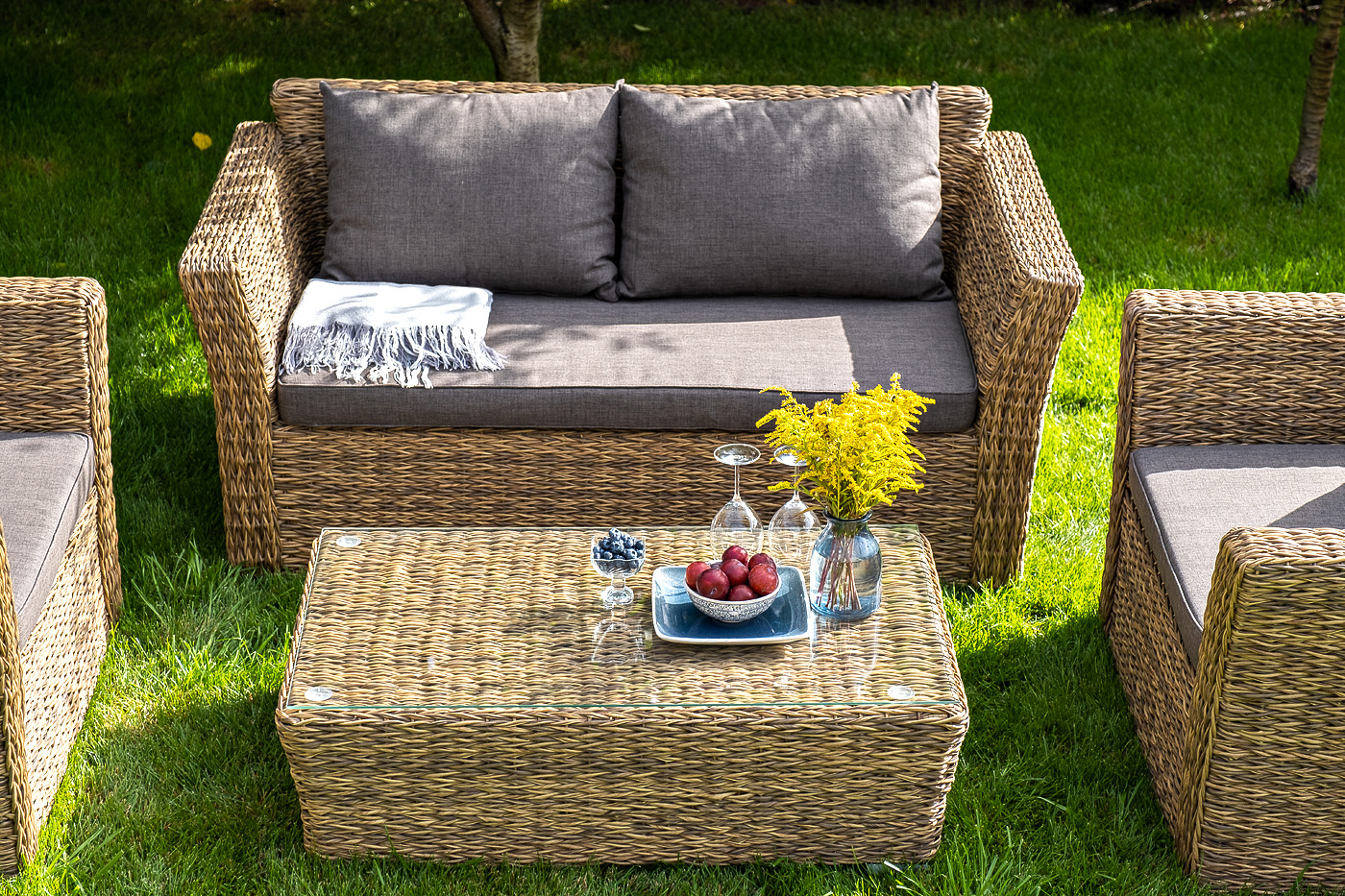 Прочный алюминиевый каркас усиливает устойчивость мебели. Его дополняет соломенная оплетка, которая представлена из искусственного ротанга вида "гиацинт".