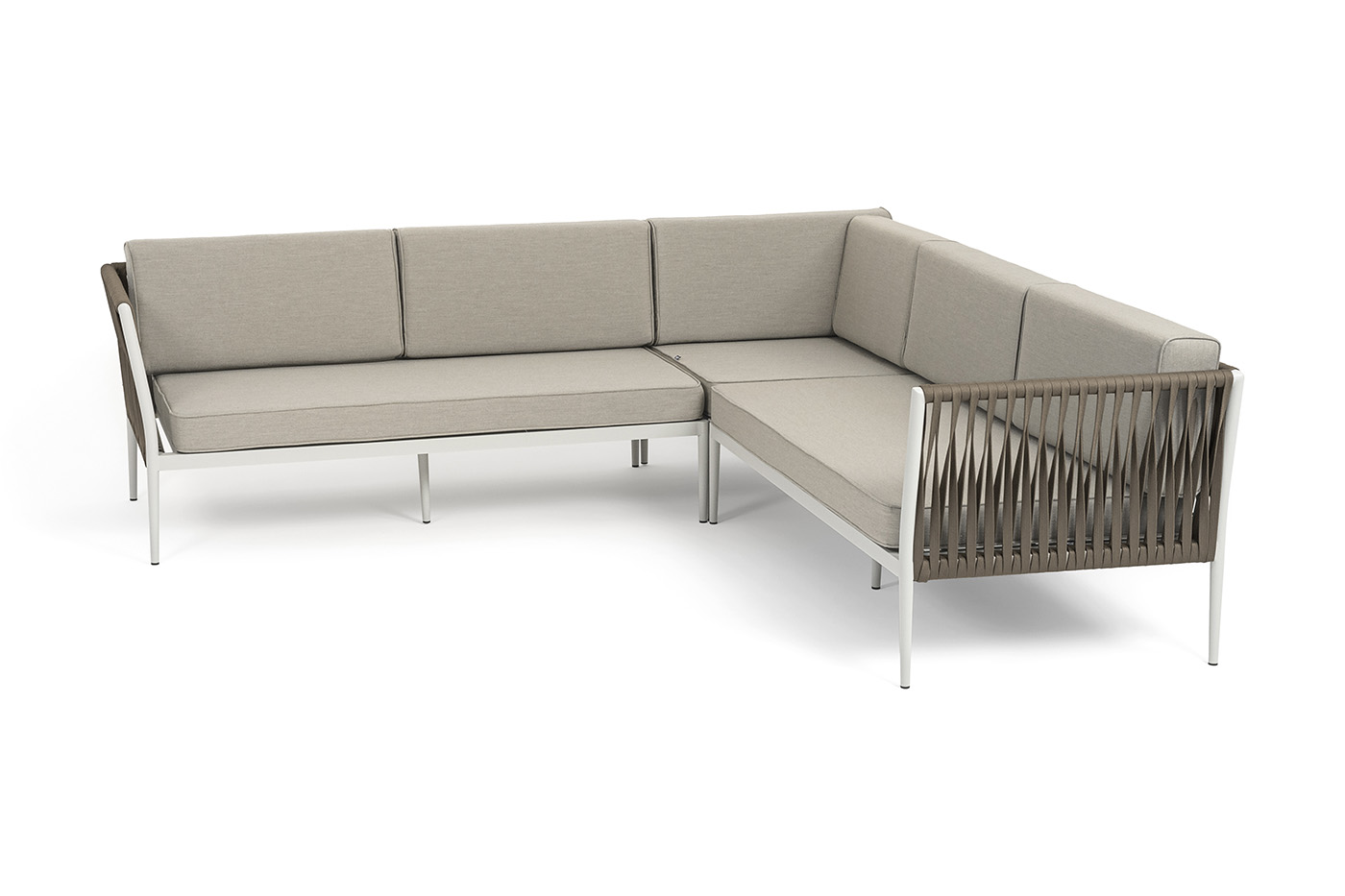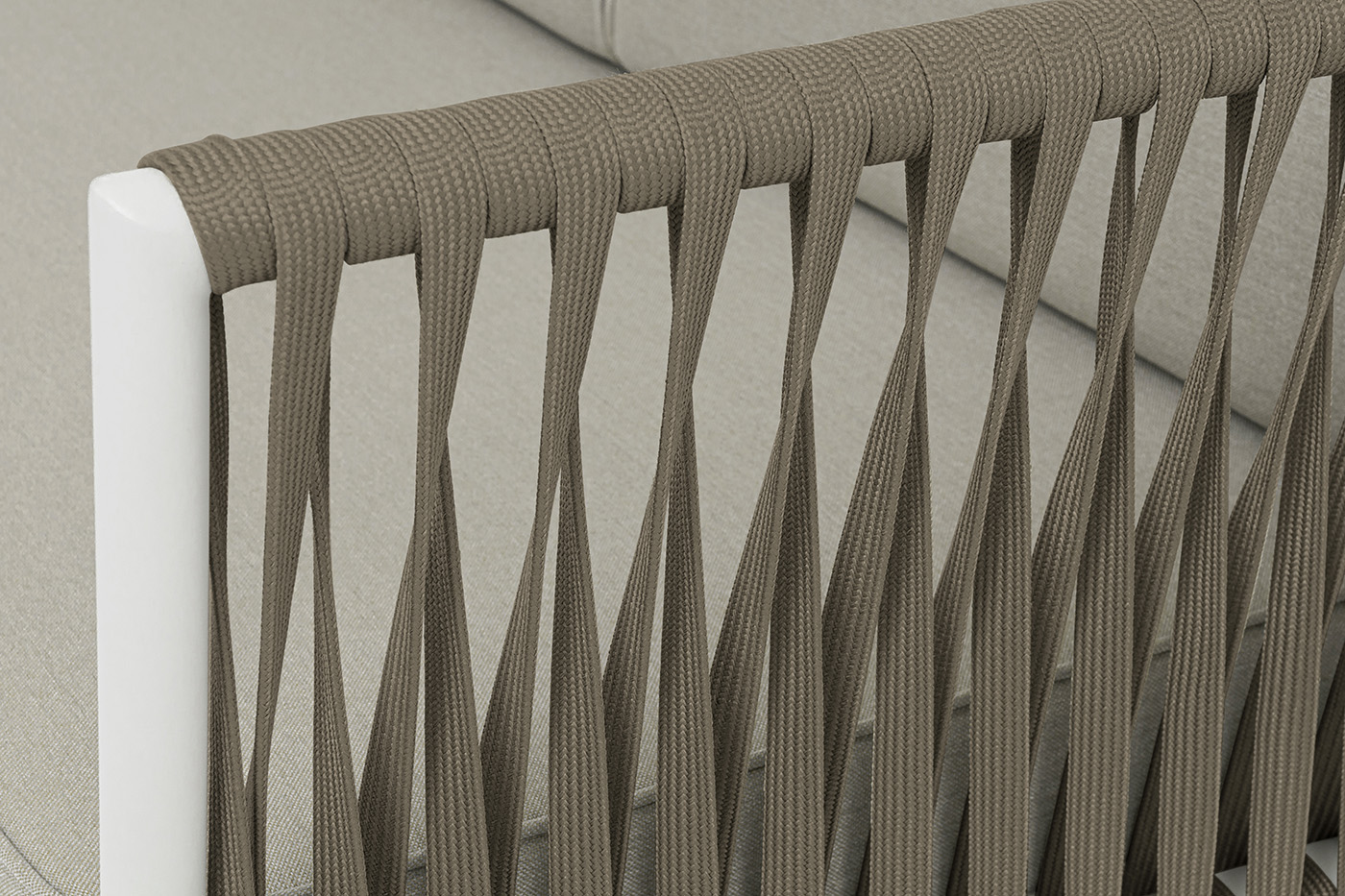 Диван имеет алюминиевый каркас, окрашенный порошковой краской в светло-серый (RAL7035) цвет. Боковины каркаса вручную оплетены плоским роупом - эластичными синтетическими лентами, изготовленными из высокопрочных полиэфирных волокон. Цвет оплетки - серо-коричневый.