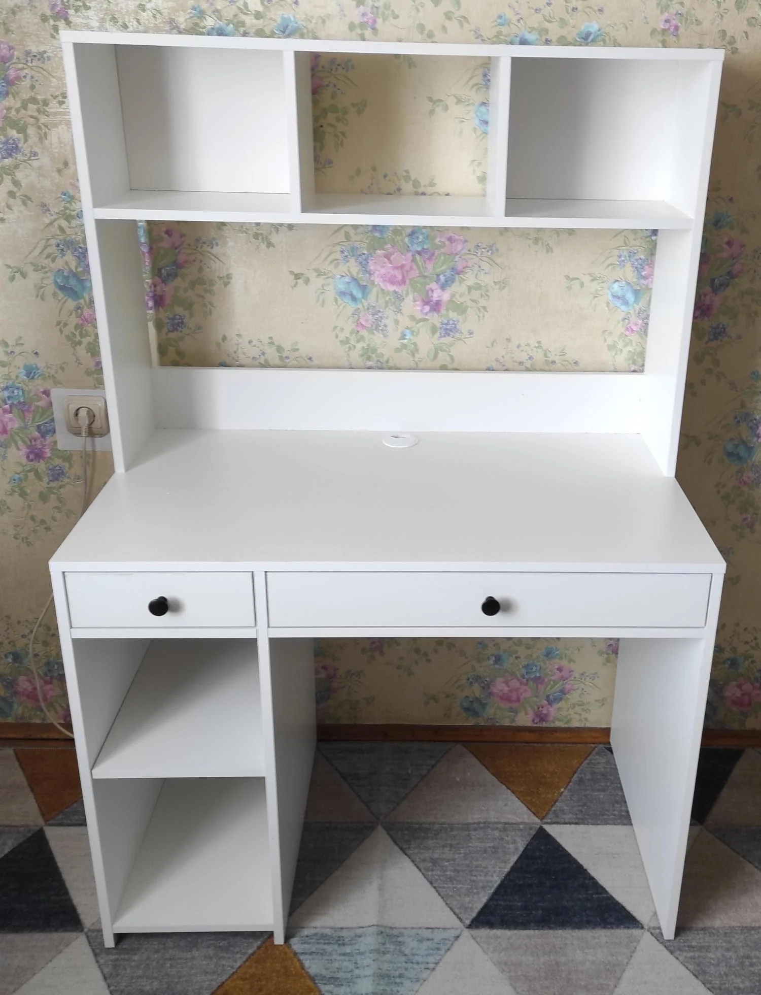 Под столешницей 2а выдвижных ящика, слева тумба с 2я полками.