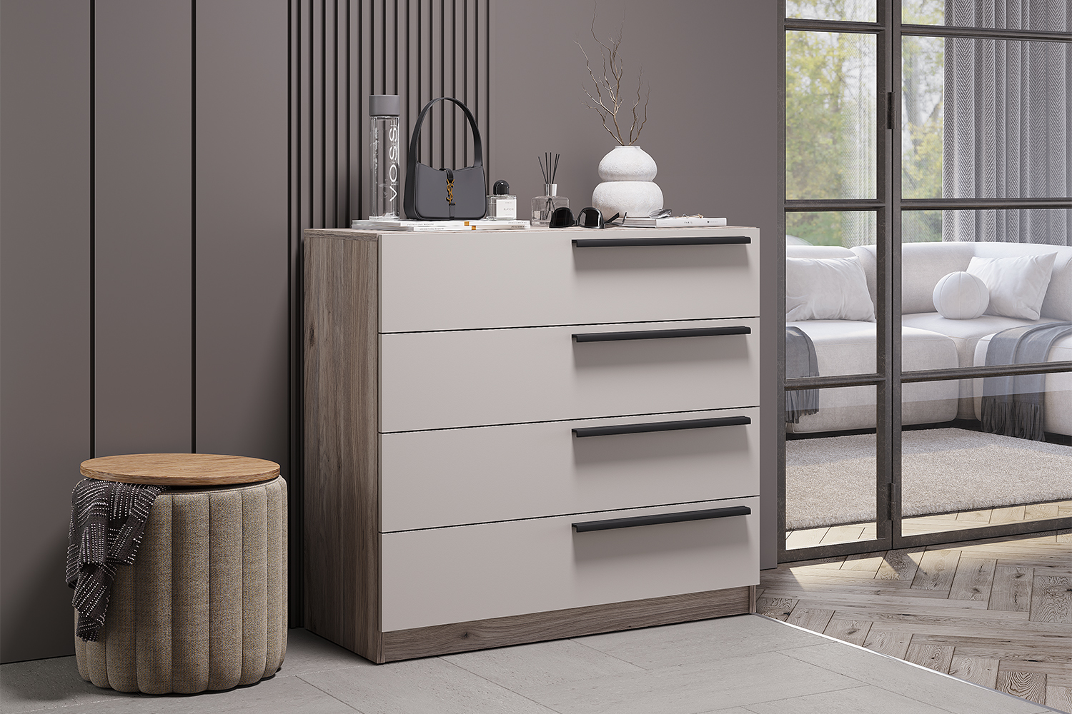 Комод состоит из 4 выдвижных ящиков на шариковых направляющих, которые позволят удобно хранить одежду, белье и прочие аксессуары.