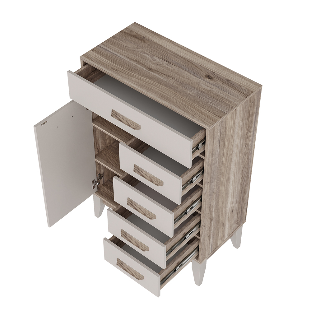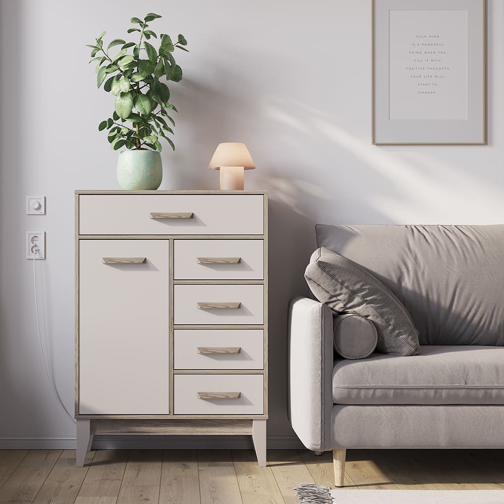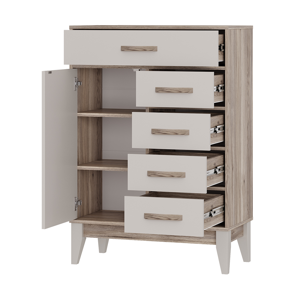 Компактный комод Скандика оснащён пятью выдвижными ящиками с плавным механизмом открытия и полкой за фасадом. Данный комод украсит вашу спальню, гостиную и даже детскую.