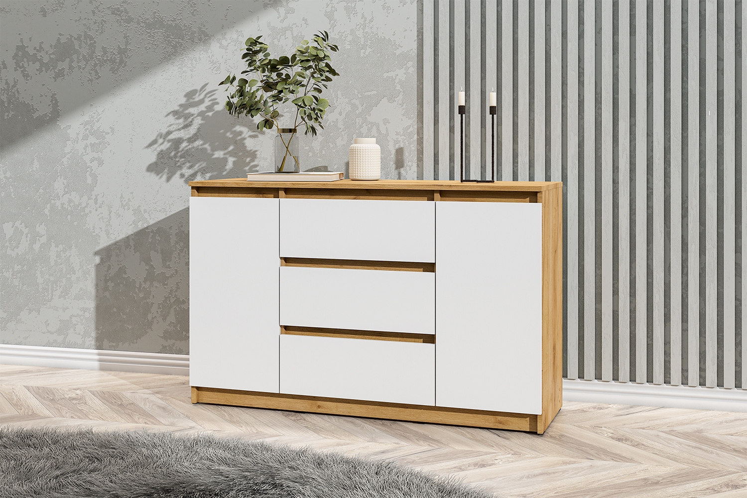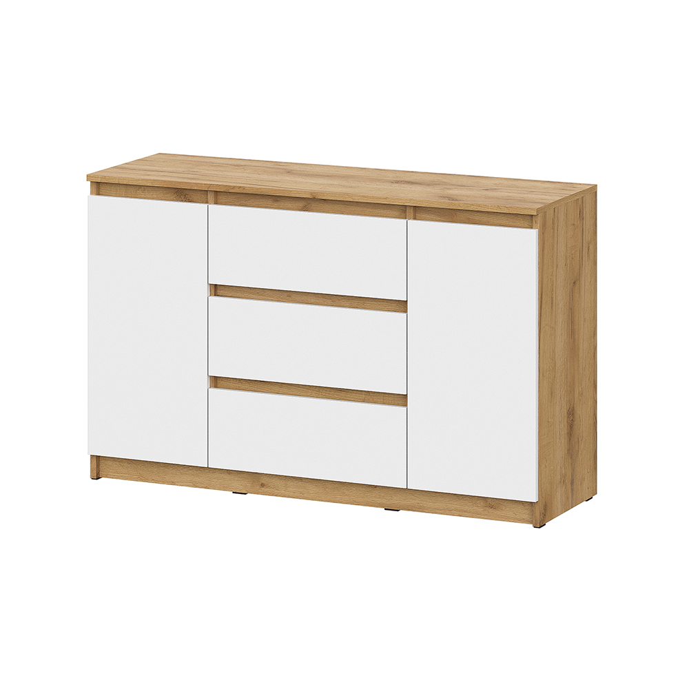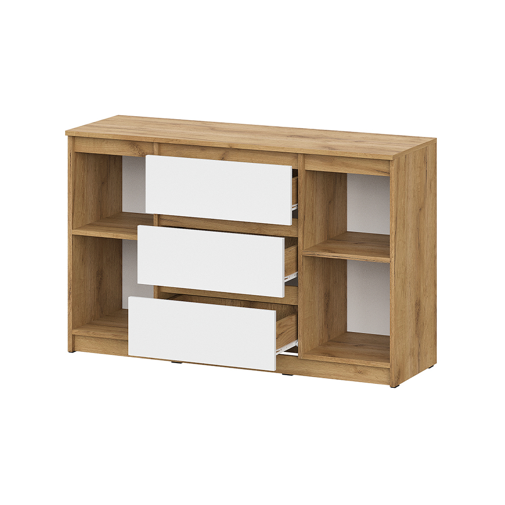 Комод с ящиками из модульной серии Денвер дополнит современный интерьер комнаты. Три вместительных ящика и полки за распашными дверьми позволят организовать место хранения белья и одежды, аксессуаров и других нужных предметов.