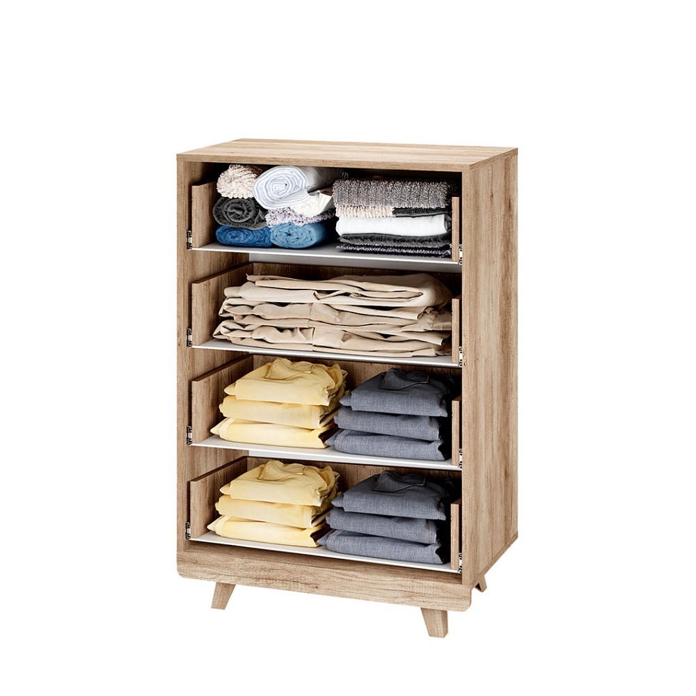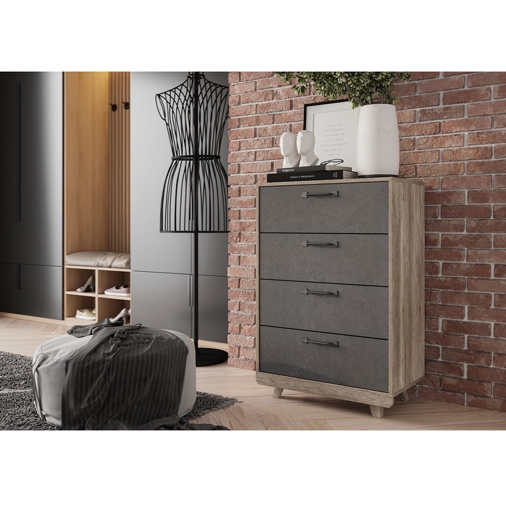 Отличительная черта комодов серии Мегаполис – сочетание теплого оттенка дерева и фотопечати с трендовым рисунком. На таких поверхностях не видно пыли и грязи, что является огромным плюсом для домохозяек. Модель КМ-02 имеет четыре ящика на шариковых направляющих.