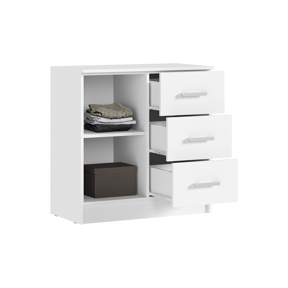 Комод с ящиками из модульной серии Бася дополнит современный интерьер комнаты. Вместительные ящики и полки за распашными дверьми позволят организовать место хранения белья и одежды, аксессуаров и других нужных предметов.