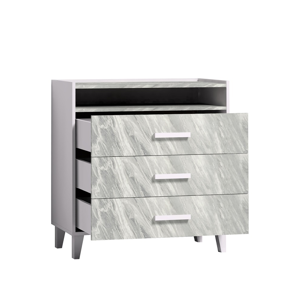 Низкий комод Айрис будет гармонично смотреться в просторной спальне в современном стиле. В трех ящиках на направляющих плавного и бесшумного выдвижения поместятся постельные принадлежности, белье и одежда в сложенном виде. Каждый ящик выдерживает нагрузку до 10 кг. Трапециевидные ручки в том же декоре, что и корпус, изготовлены из массива дерева и удобны для ежедневного использования. Тонкие опоры оптимальной высоты позволят роботу-пылесосу беспрепятственно проезжать под комодом.