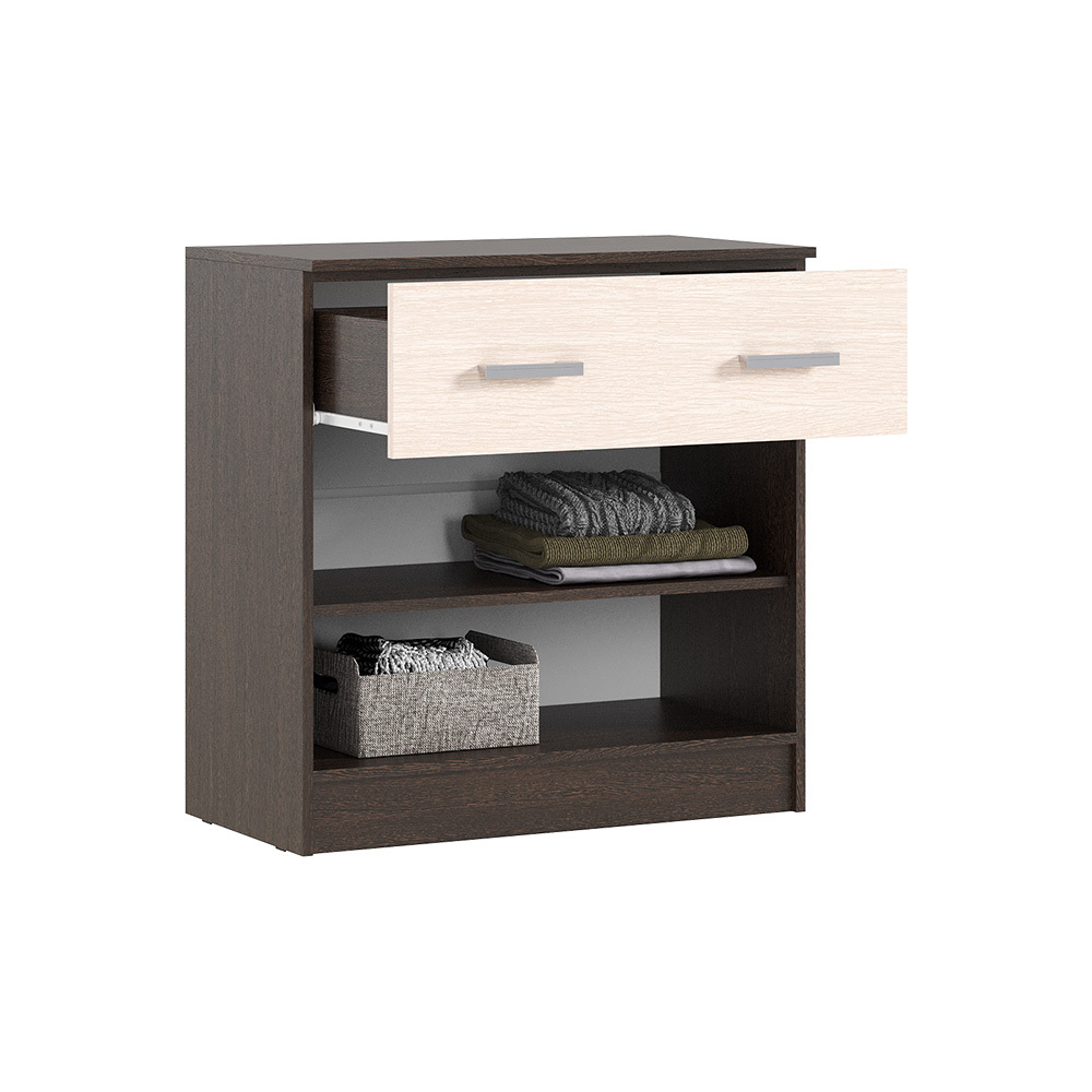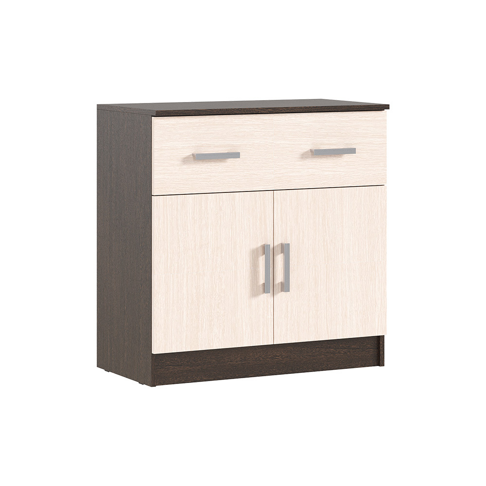 Комод из модульной серии Бася дополнит современный интерьер комнаты. Вместительные ящики и полки за распашными дверьми позволят организовать место хранения белья и одежды, аксессуаров и других нужных предметов.