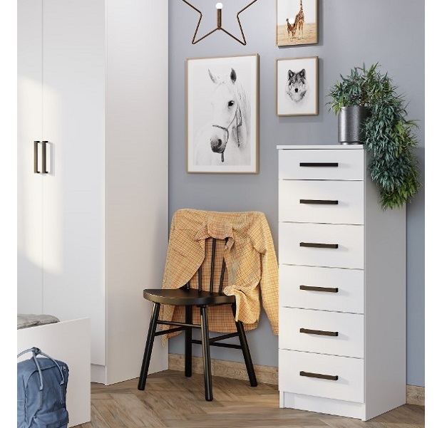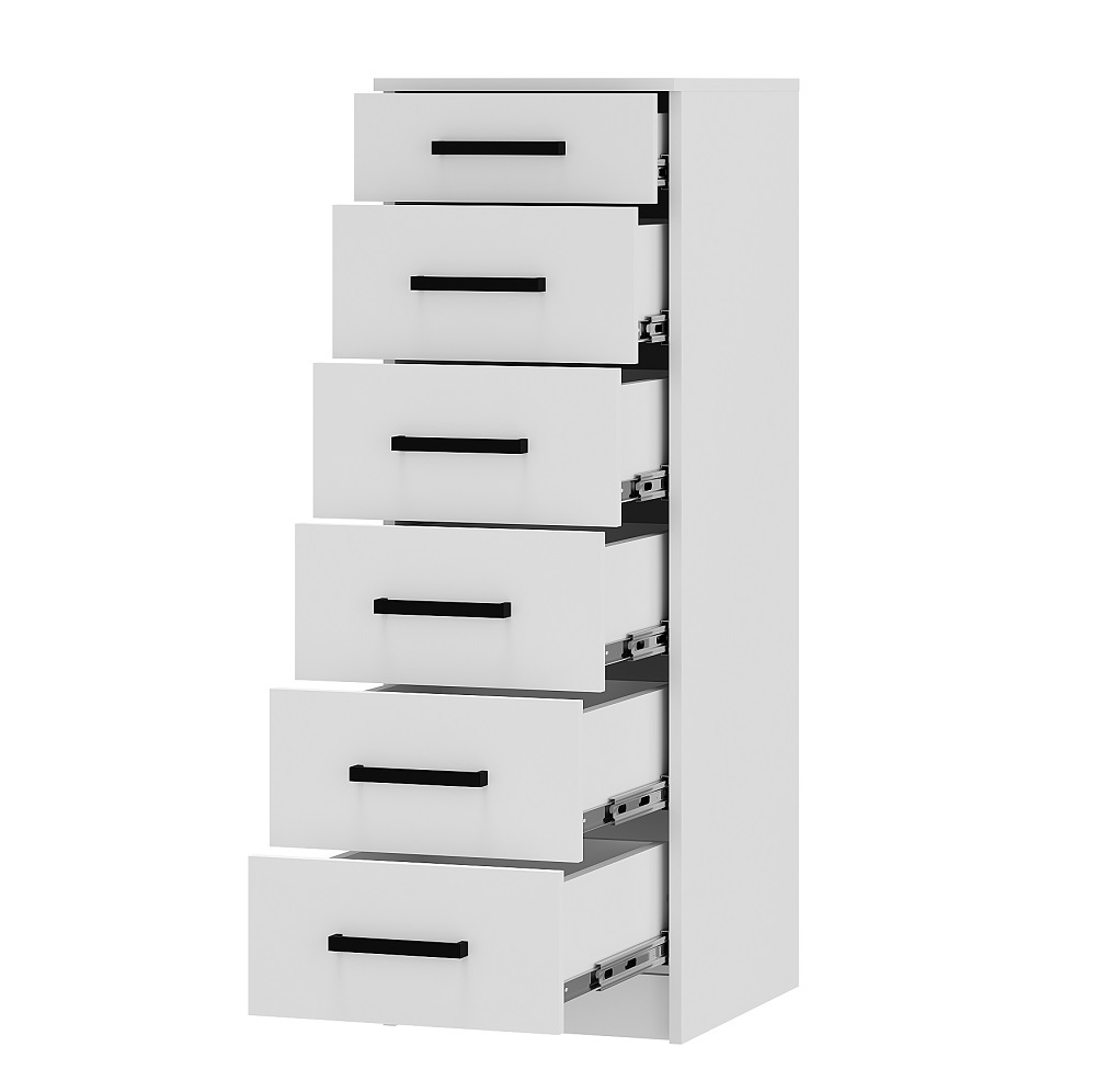 Коллекция мебели для спальни Фьюжн является воплощением эстетики минимализма. Белый цвет в сочетании с черной фурнитурой, строгие линии, простой конструктив – все это лучшие черты мебельного дизайна. Высокий комод с 6-тью ящиками на направляющих плавного выдвижения поможет организовать хранение вещей в сложенном виде, аксессуаров, книг.