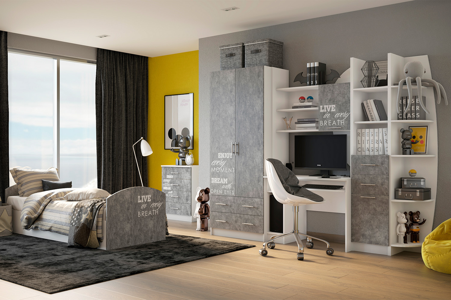 Комод с ящиками из модульной серии Юниор дополнит современный интерьер комнаты. Вместительные ящики позволят организовать место хранения белья и одежды, аксессуаров и других нужных предметов.