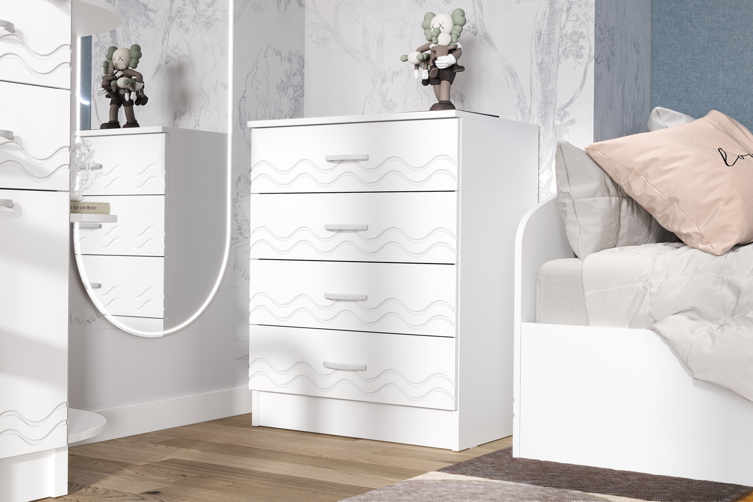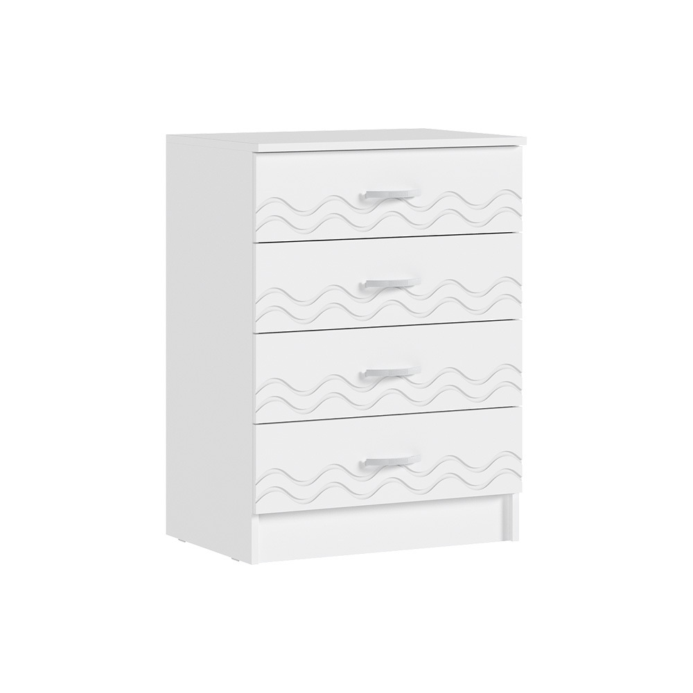 Комод с ящиками из модульной серии Юниор дополнит современный интерьер комнаты. Вместительные ящики и полки за распашными дверьми позволят организовать место хранения белья и одежды, аксессуаров и других нужных предметов.