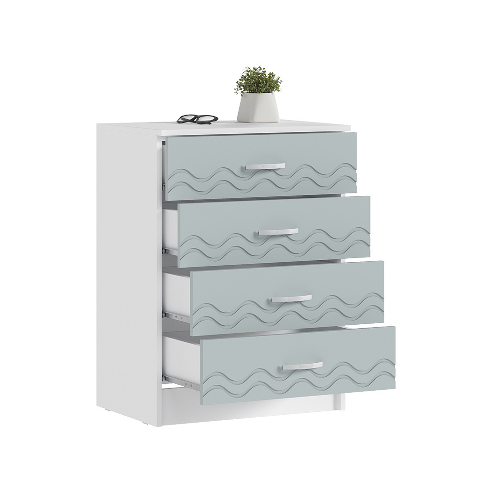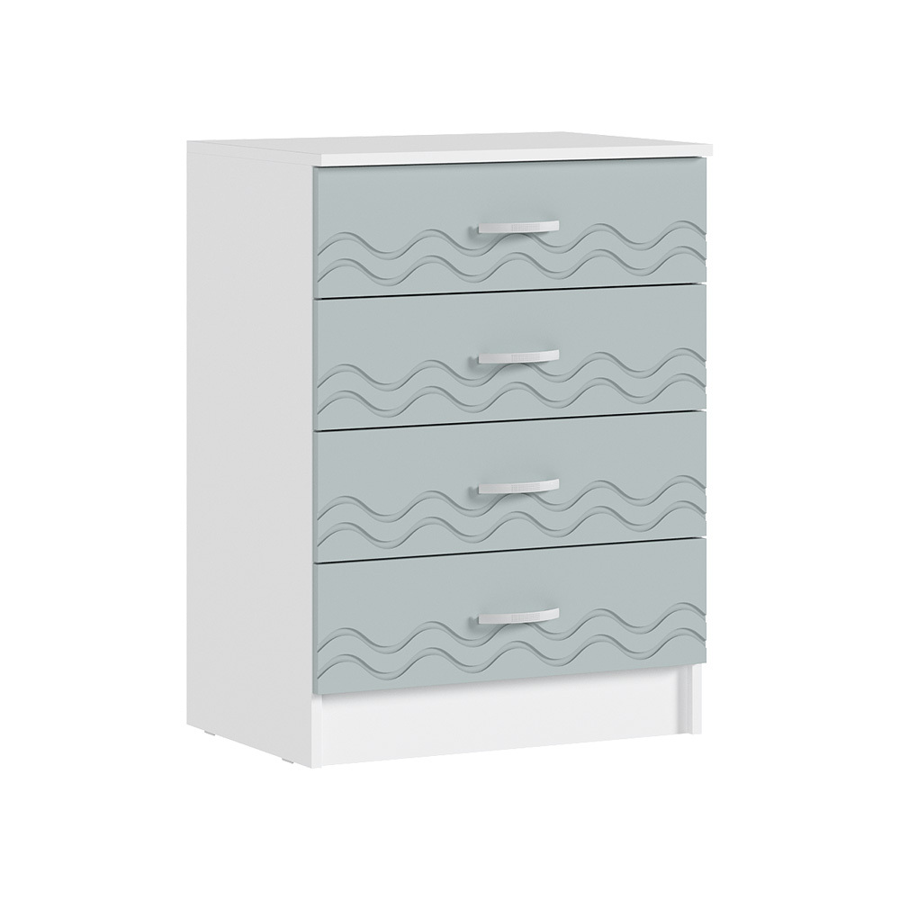 Комод с ящиками из модульной серии Юниор дополнит современный интерьер комнаты. Вместительные ящики и полки за распашными дверьми позволят организовать место хранения белья и одежды, аксессуаров и других нужных предметов.