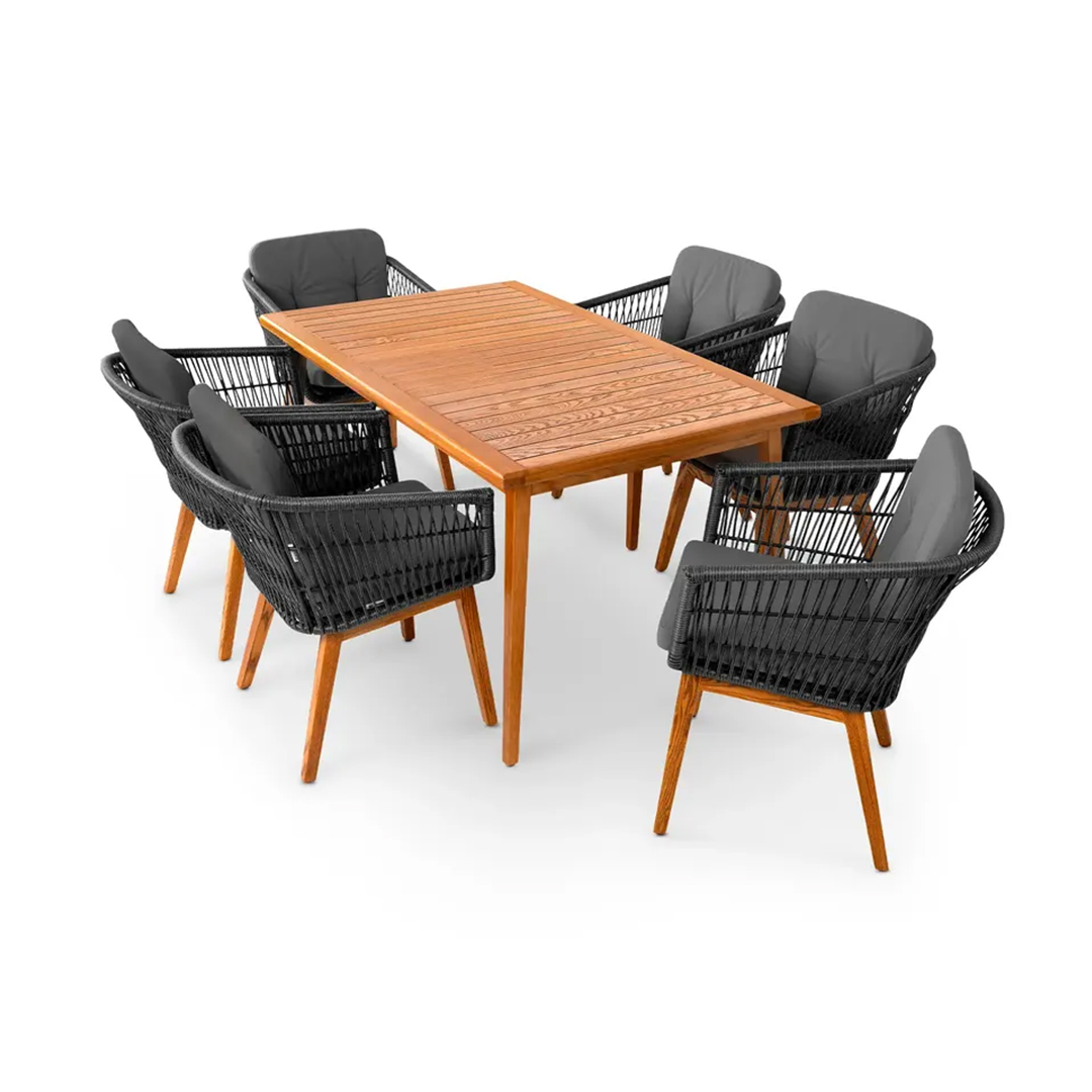 Комплект для террасы или ресторана: прямоугольный стол из массива ясеня и шесть стульев из ротанга и дерева. Единая дизайнерская концепция создаёт гармоничное и гостеприимное пространство.
