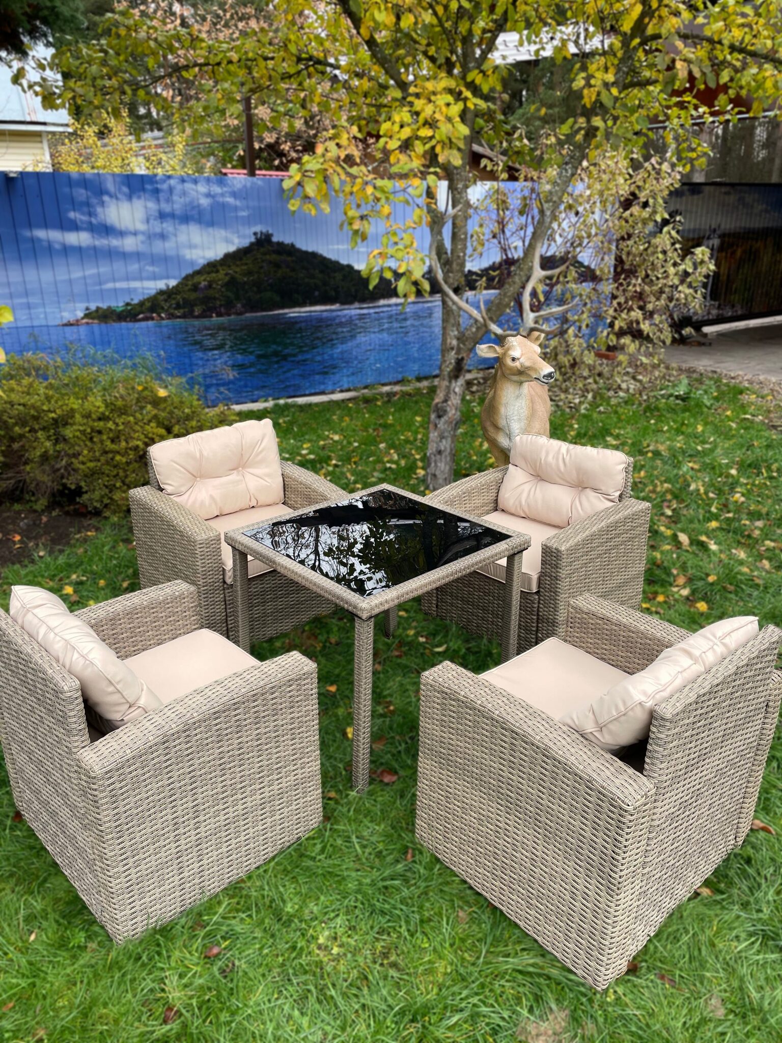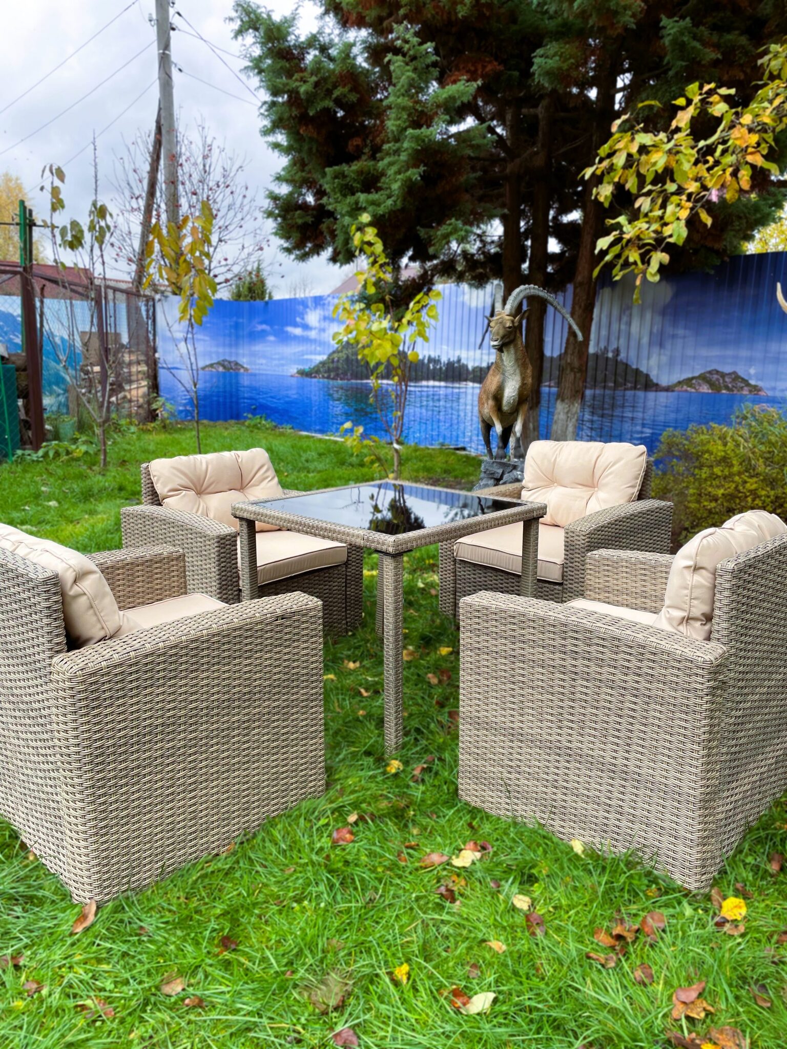 Комплект мебели из искусственного ротанга "Анталия" с четырьмя креслами "Сантьяго" в оттенке greige —станет прекрасным дополнением для террасы, сада или даже балкона, создавая уютную атмосферу для отдыха и общения.