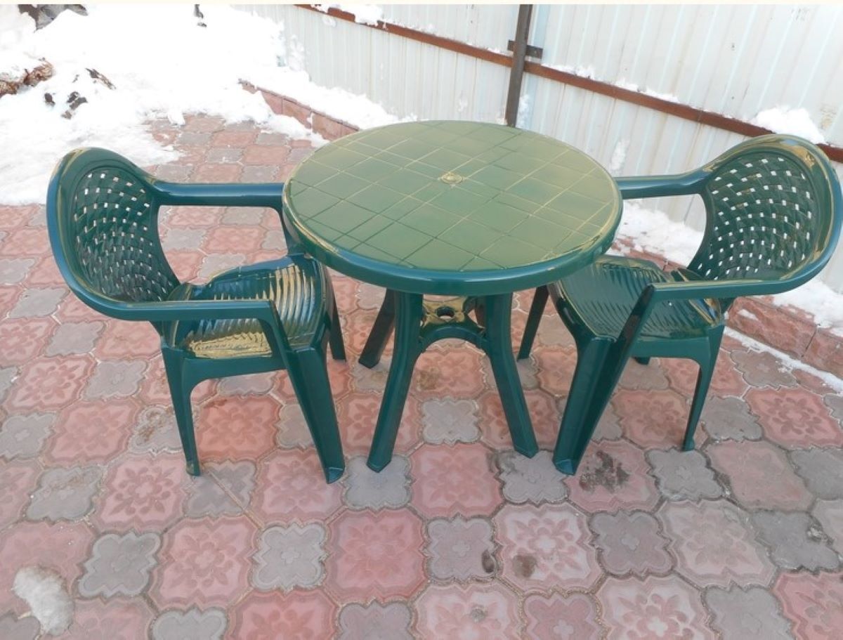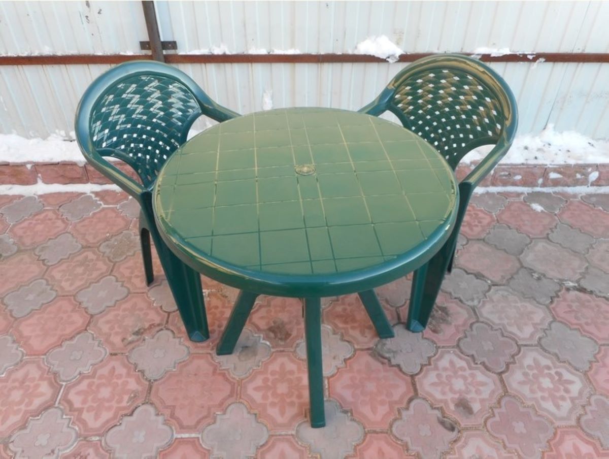 Стол диаметром 80 см высотой 74 см с геометрическим рисунком на поверхности и оригинальной формой ножек. В столешнице имеется закрывающееся отверстие для вставки зонта, а в ножки встроены регуляторы устойчивости. При необходимости, стол легко разбирается.