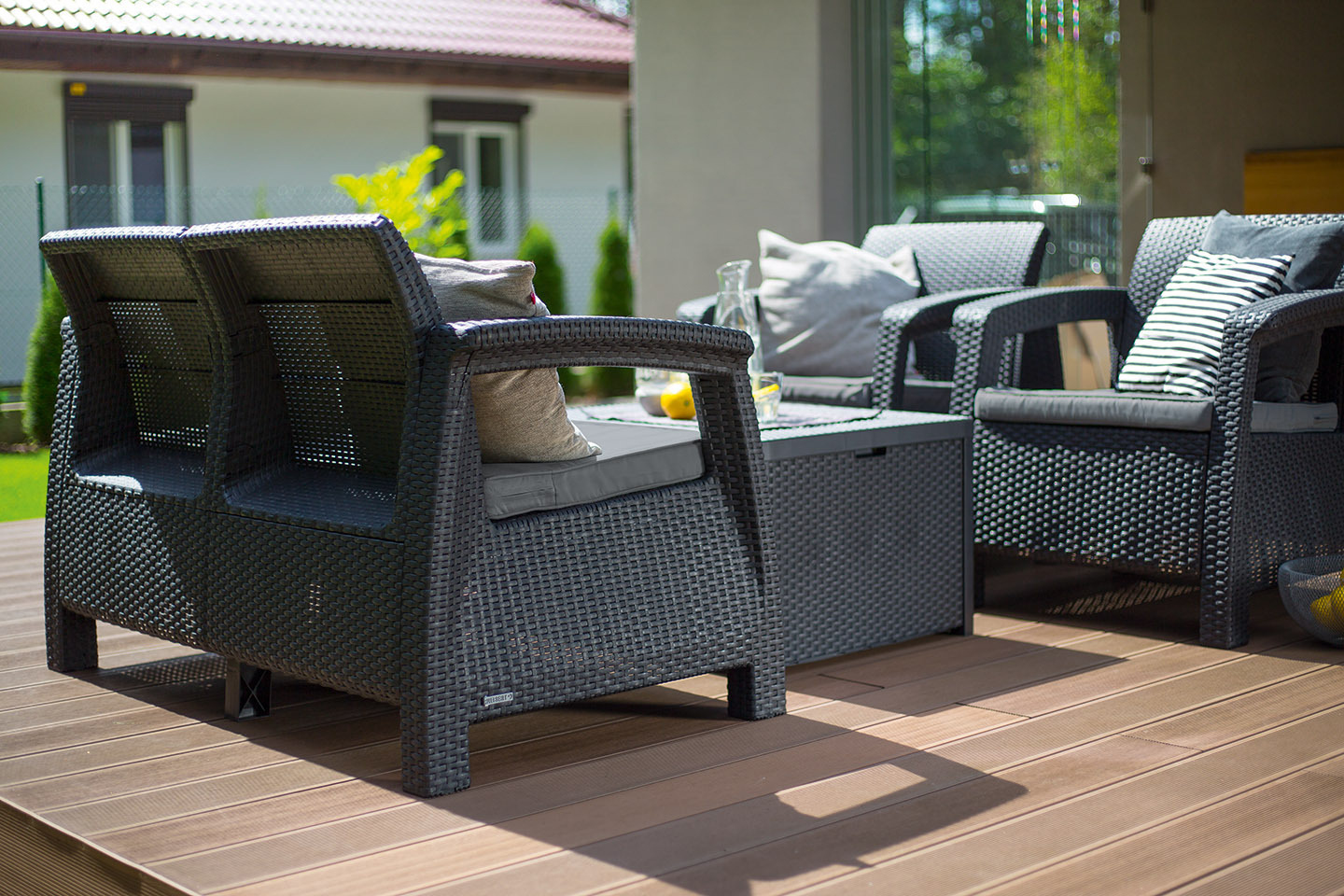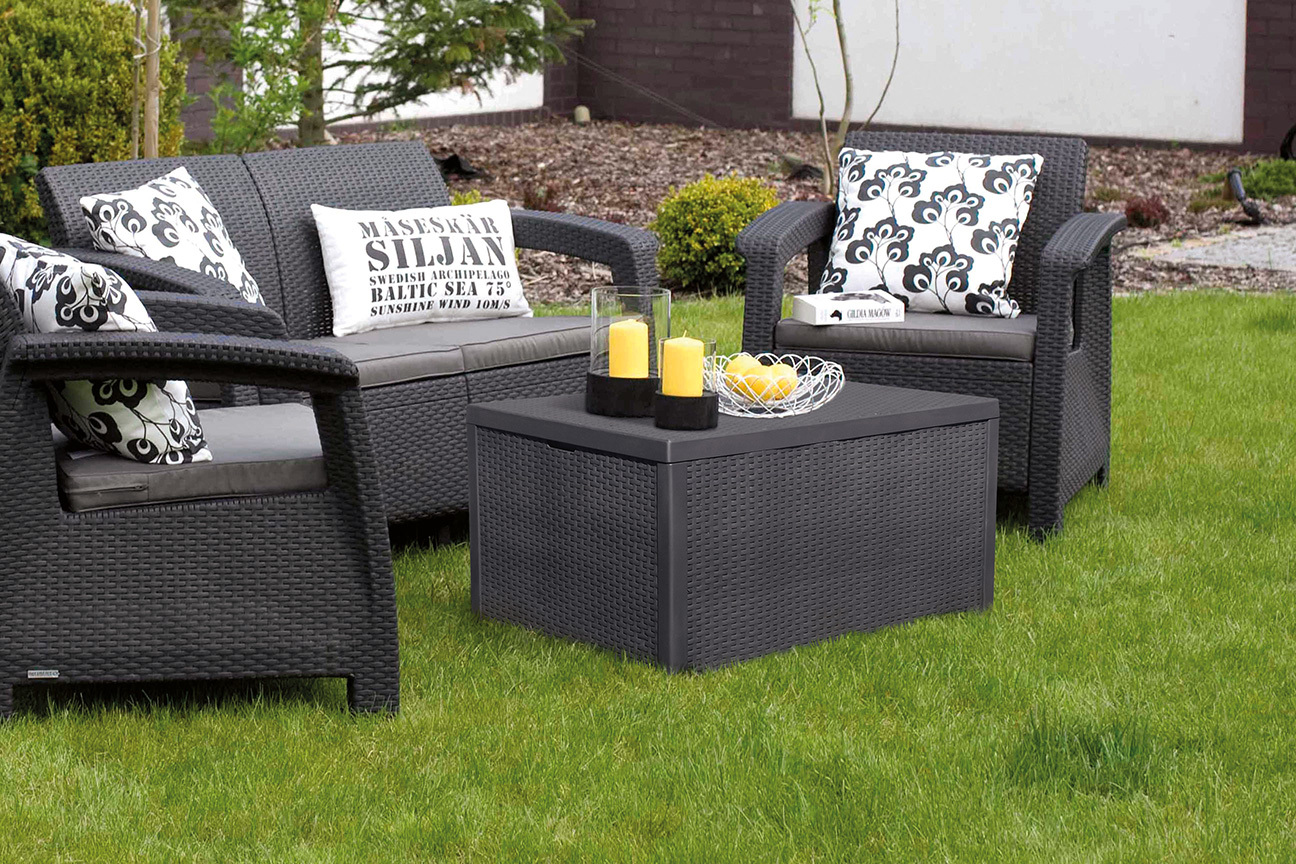 Corfu box - это элегантный мебельный гарнитур с фактурой, напоминающей ротанг, который состоит из двух кресел, двухместного дивана и столика-сундука. Продукт оснащён мягкими подушками сидений. В столе-сундуке всегда можно спрятать вещи от дождя. Мебель с легкой и одновременно устойчивой конструкцией красиво впишется в любое приусадебное пространство, такое как сад или терраса. Набор очень легко чистится. Изготовлен из стойкого к воздействию УФ-излучения пластмассы.