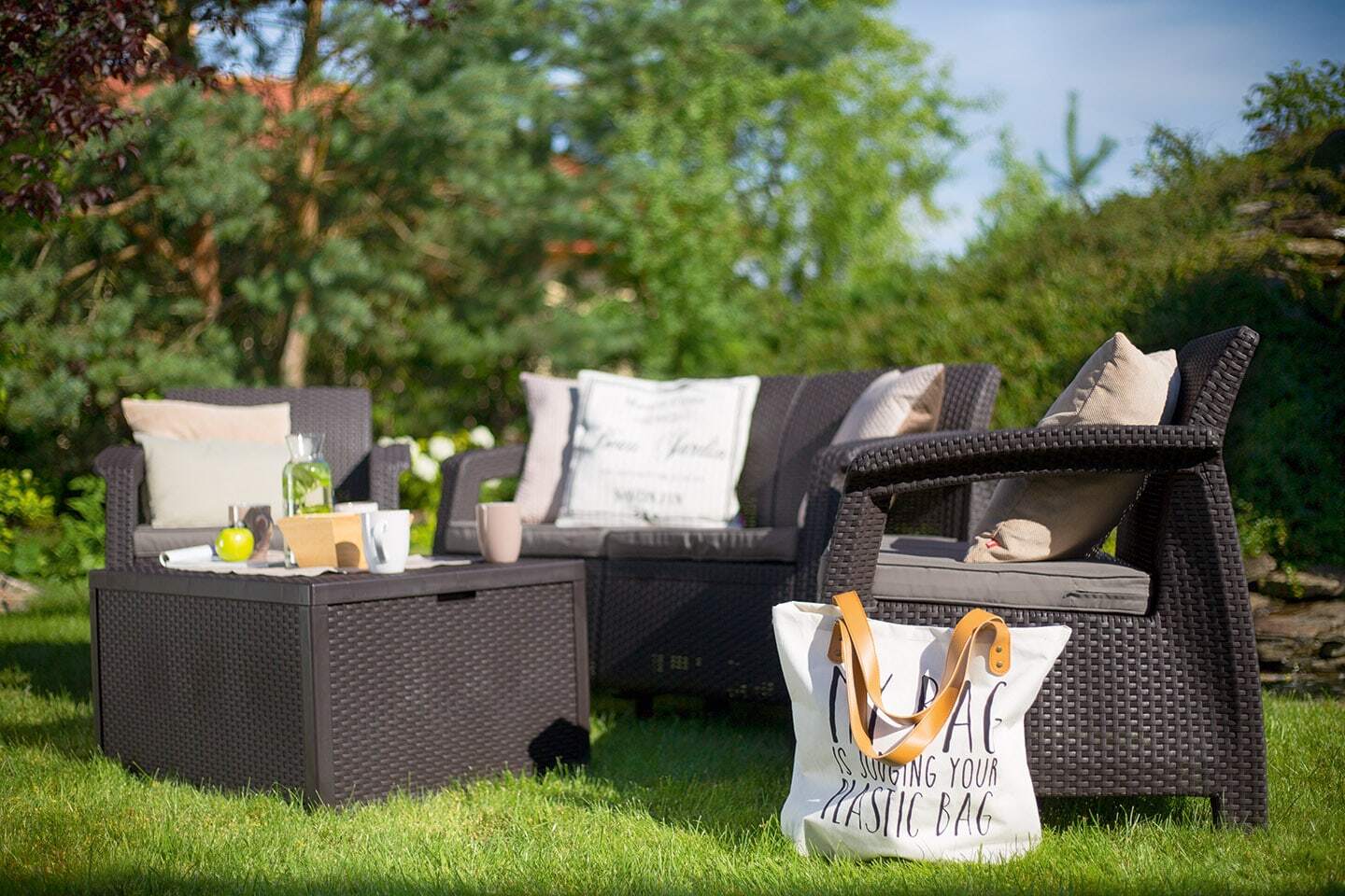 Corfu box - это элегантный мебельный гарнитур с фактурой, напоминающей ротанг, который состоит из двух кресел, двухместного дивана и столика-сундука. Продукт оснащён мягкими подушками сидений. В столе-сундуке всегда можно спрятать вещи от дождя. Мебель с легкой и одновременно устойчивой конструкцией красиво впишется в любое приусадебное пространство, такое как сад или терраса. Набор очень легко чистится. Изготовлен из стойкого к воздействию УФ-излучения пластмассы.