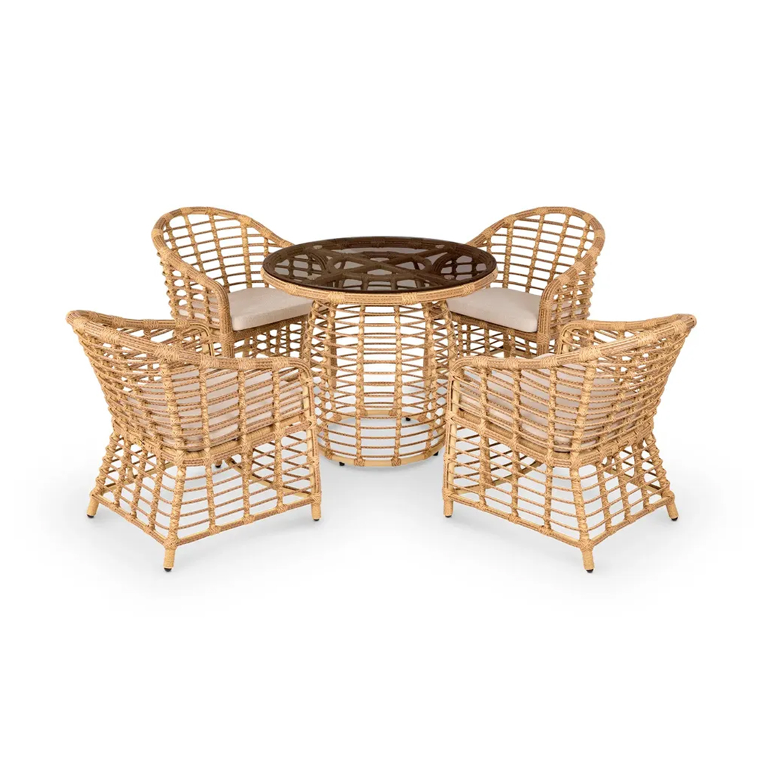 Готовый комплект МИРО объединяет четыре просторных кресла и круглый стол в едином дизайнерском решении. Лаконичные линии, комфортная посадка и выразительная структура плетения создают атмосферу уюта и гармонии. Комплект подходит как для частных террас и зон у бассейна, так и для коммерческих пространств — кафе, отелей, лаунж-зон.
