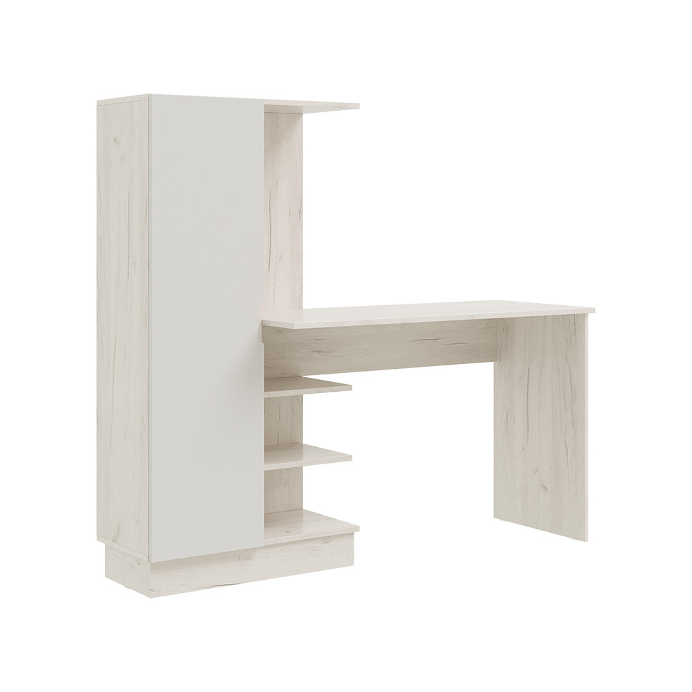 Компьютерный стол Юниор-4 сочетает в себе преимущества просторного письменного стола и вместительного стеллажа, превращаясь тем самым в полноценное рабочее место. На столе хватит места для ноутбука и настолько лампы, а на открытых полках — для книг, канцелярии и различных мелочей, которые необходимо иметь под рукой во время рабочего процесса.
