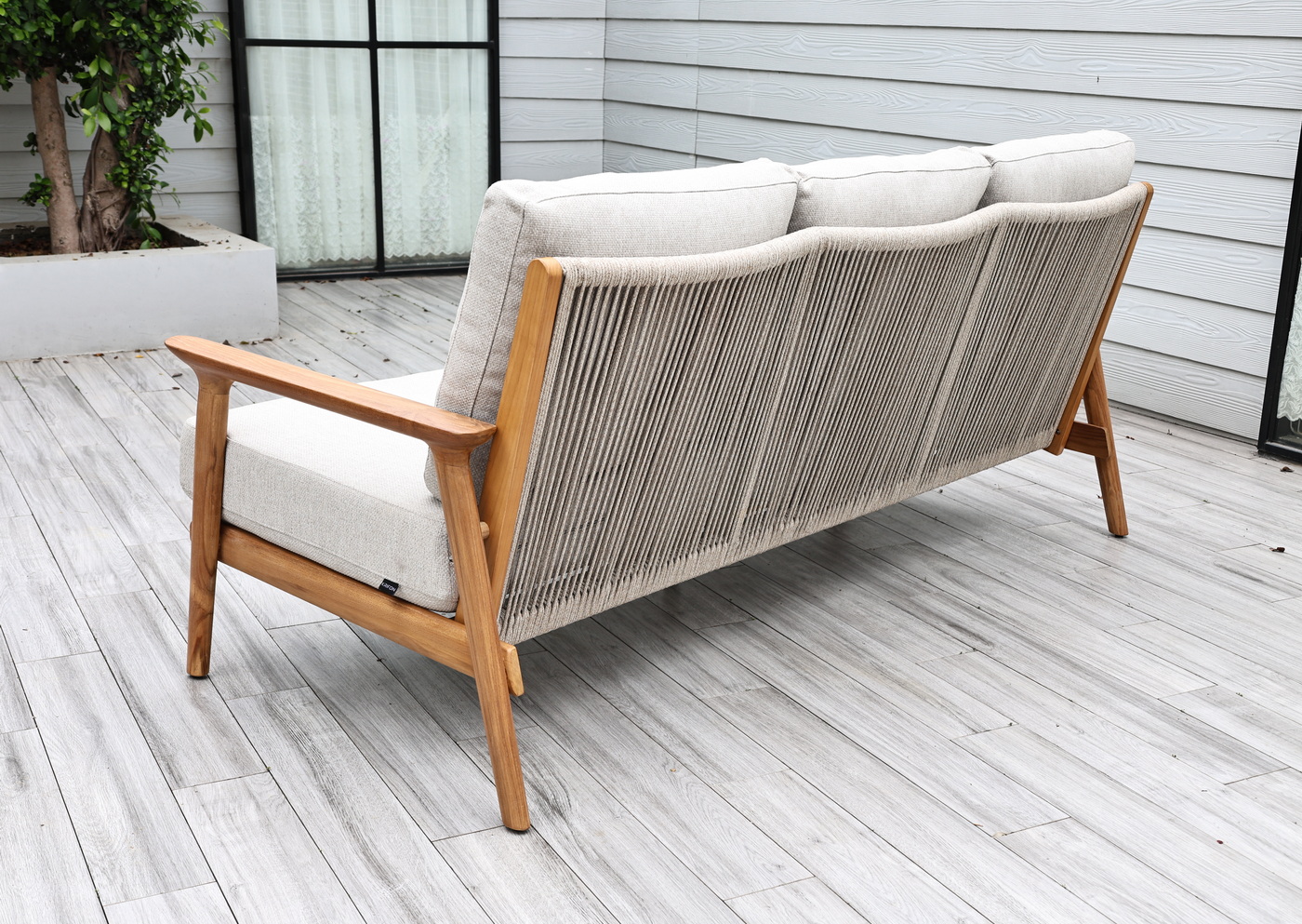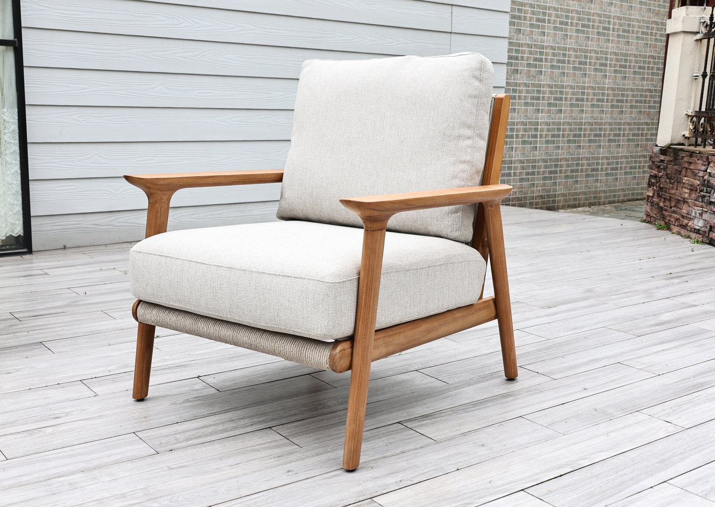 Каркас выполнен из тика — благородной древесины, известной своей прочностью, устойчивостью к внешним воздействиям и изысканной текстурой. Тёплый древесный оттенок подчёркивает природную эстетику мебели.