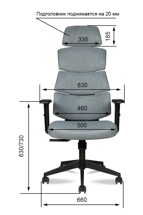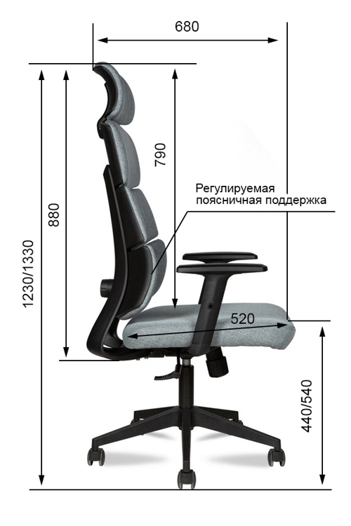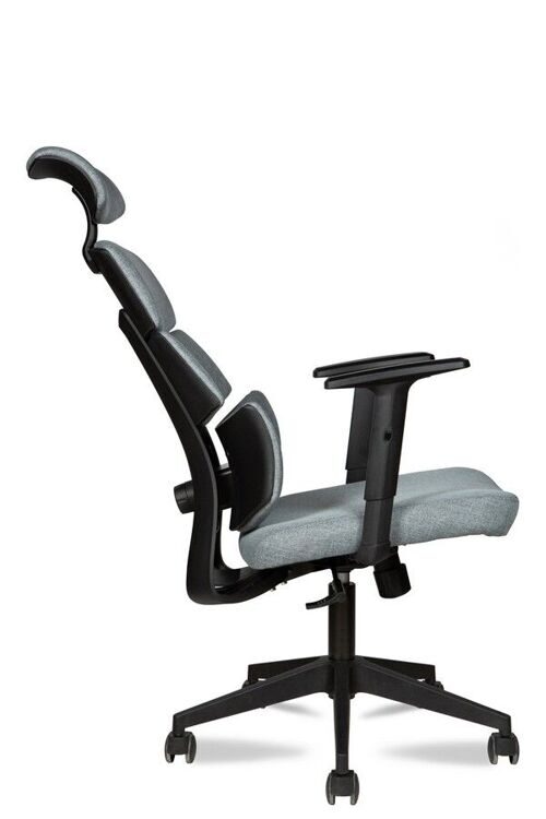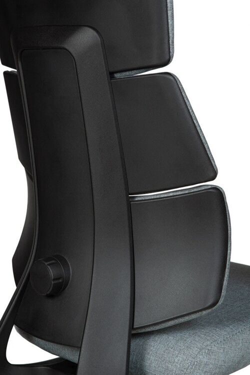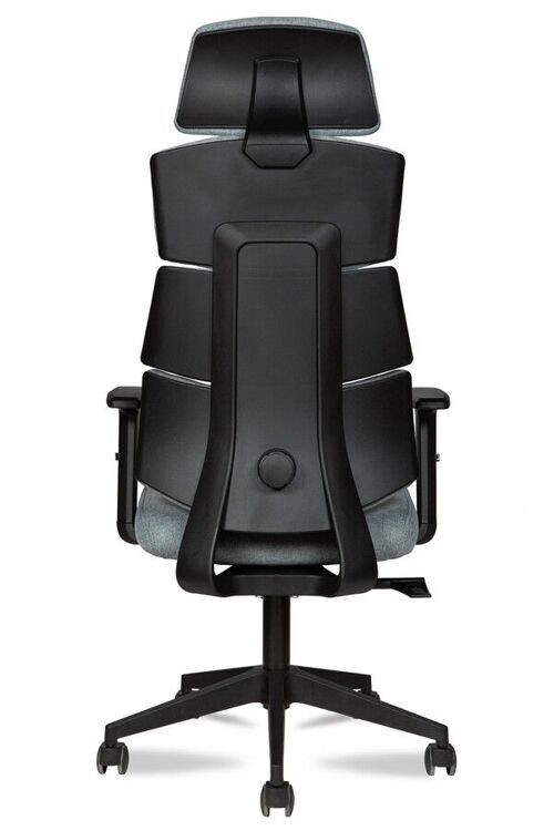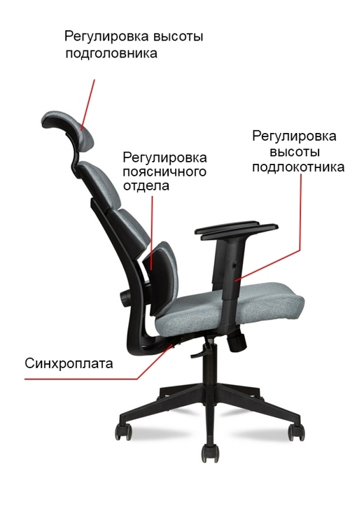 Кресло оснащено четырёхсекционной спинкой, где верхняя секция представляет собой регулируемый подголовник, обеспечивающий комфортную поддержку головы и шеи, а нижняя секция — это поясничная поддержка с регулируемым упором, которая помогает сохранить правильную осанку и снять нагрузку с поясницы. Подлокотники кресла регулируются по высоте, что позволяет настроить их для максимального удобства.