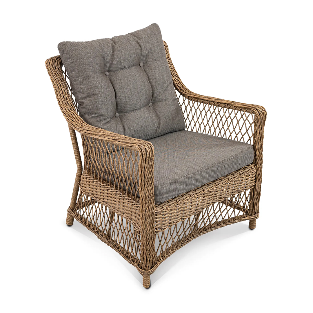 Кресло ИМПЕРО сочетает элегантный силуэт, комфорт и надёжность. Высокая спинка обеспечивает эргономичную поддержку, а прочный алюминиевый каркас, скрытый под аккуратным плетением из искусственного ротанга, гарантирует долговечность и устойчивость к нагрузкам до 120 кг. Идеальный выбор для обустройства лаунж-зон на террасе, в саду или на веранде.