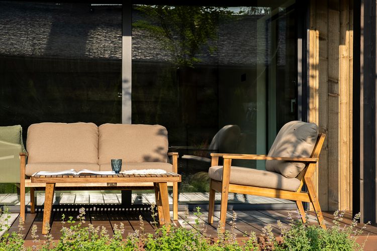 МОНА – современная коллекция садовой мебели из акации в скандинавском стиле в комбинации массива акации и бежевых подушек.