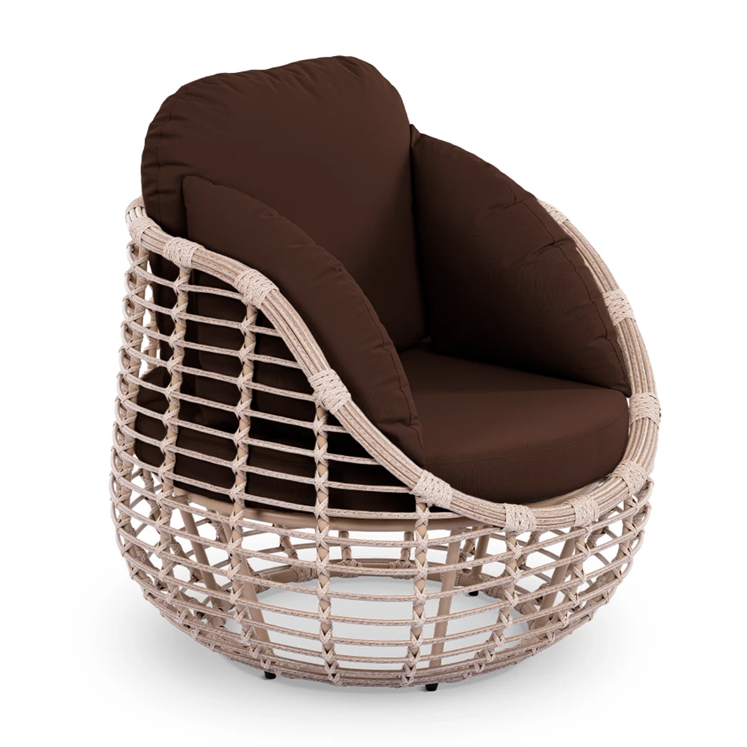Элегантное кресло для отдыха на открытом воздухе. Лаконичный округлый силуэт делает модель выразительным акцентом в пространстве, а конструкция из алюминия и искусственного ротанга гарантирует надёжность и долговечность. Мягкая подушка нейтрального оттенка обеспечивает комфорт и гармонично дополняет современный дизайн. Подходит для террасы, сада или кафе
