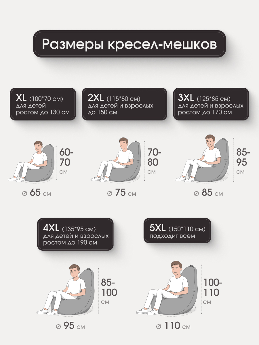 Кресло-мешок из велюра – одна из самых популярных моделей фабрики Дримбэг. Размеры кресел (по чехлу): XL (100*70 см) - для детей до 130 см. 2XL (115*80 см) - для детей и подростков до 150 см. 3XL (125*85 см) - для детей, подростков и взрослых до 170 см. 4XL (135*95 см) - идеально подходит для взрослых до 190 см. 5XL (150*110 см) - максимальный уровень комфорта, подходит для любого возраста и роста. Кресло-мешок состоит из двух чехлов. Внешний чехол на молнии, можно снять и постирать в стиральной машине в режиме деликатной стирки. Ткань - Велюр. Материал мягкий и приятный на ощупь, не выцветает, устойчив к истиранию, выдерживает большое количество стирок. Материал не требует частой стирки, загрязнения легко удаляются влажной салфеткой. Подходит для отдыха в квартире или на даче. Внутренний чехол сделан из нетканого материала, мы используем Спанбонд высокой плотности, который выдерживает большие нагрузки. Внутренний чехол наполнен гранулами пенополистирола. Наши гранулы, диаметром 1-3 мм, позволяют сохранять заявленный объем товара в несколько раз дольше, чем у производителей, использующих гранулы диаметром более 3 мм. На рынке бескаркасной мебели популярность крупных гранул объясняется их дешевизной, но, к сожалению, не гарантирует долгий срок службы изделия. Внешний и внутренний чехлы соединены друг с другом липучкой, благодаря чему не придется поправлять кресло после каждой посадки. Отверстия (люверсы) для отвода воздуха, исключают разрыв ткани при прыжке на кресло. Удобная ручка позволяет без труда переносить кресло даже детям. Швы надежно прошиты армированными нитями, благодаря чему кресло-груша выдерживает нагрузку до 150 кг. Молния на внутреннем чехле оснащена замком с защитой от случайного открывания. Кресло-мешок – это крутая и современная мебель для любой квартиры. Вы будете наслаждаться уютом каждый вечер перед телевизором или на балконе, а друзья оценят удобство, когда придут к вам в гости поиграть на приставке. Гарантия 12 месяцев распространяется на все наши изделия. Данная гарантия распространяется на внешний и внутренний чехол. На гранулы полистирола гарантия не распространяется, поскольку скорость усадки зависит от индивидуальных особенностей использования.