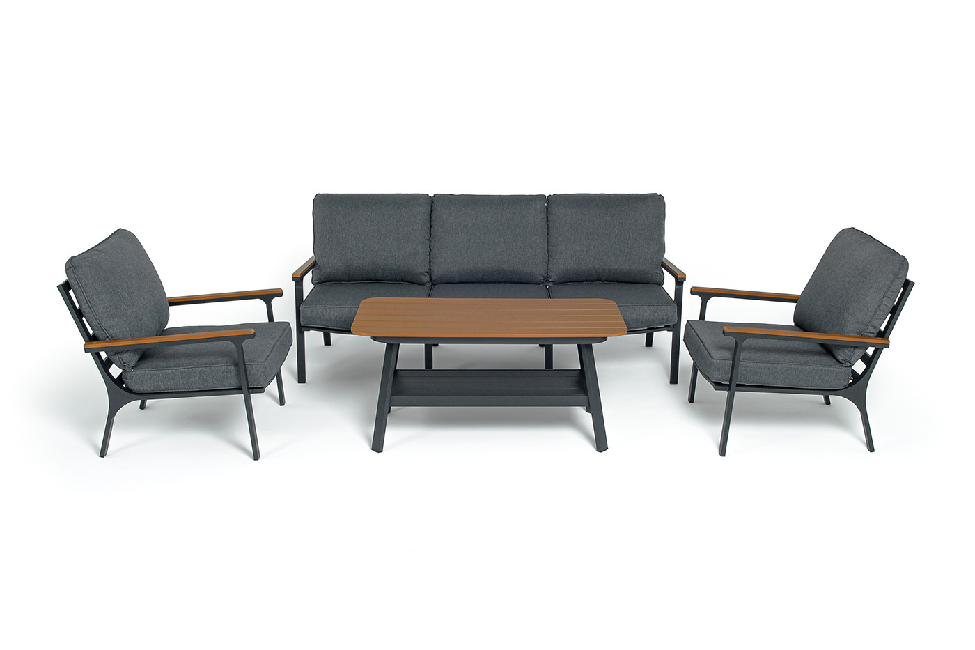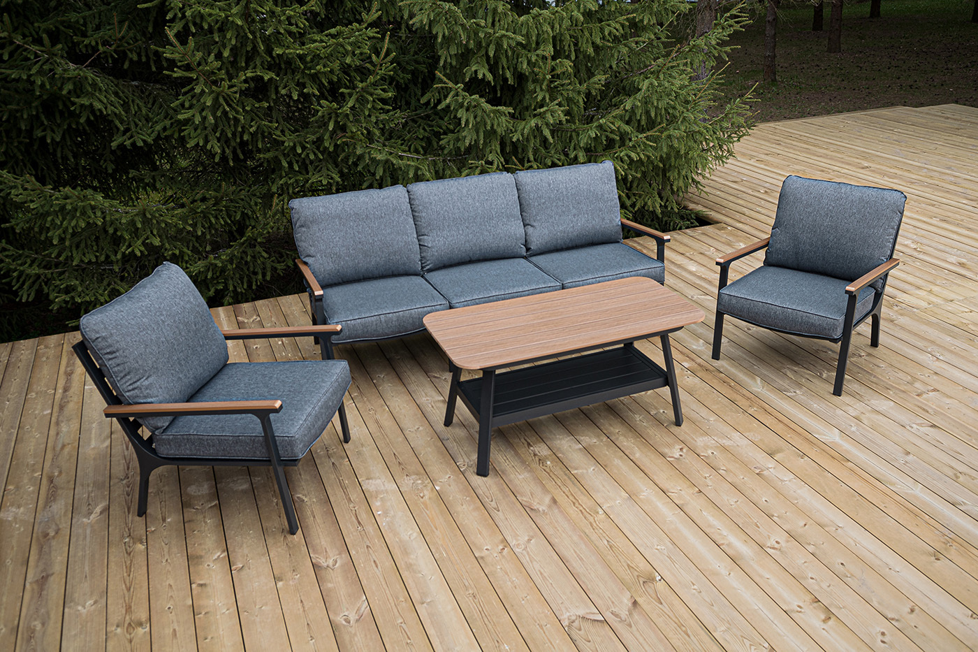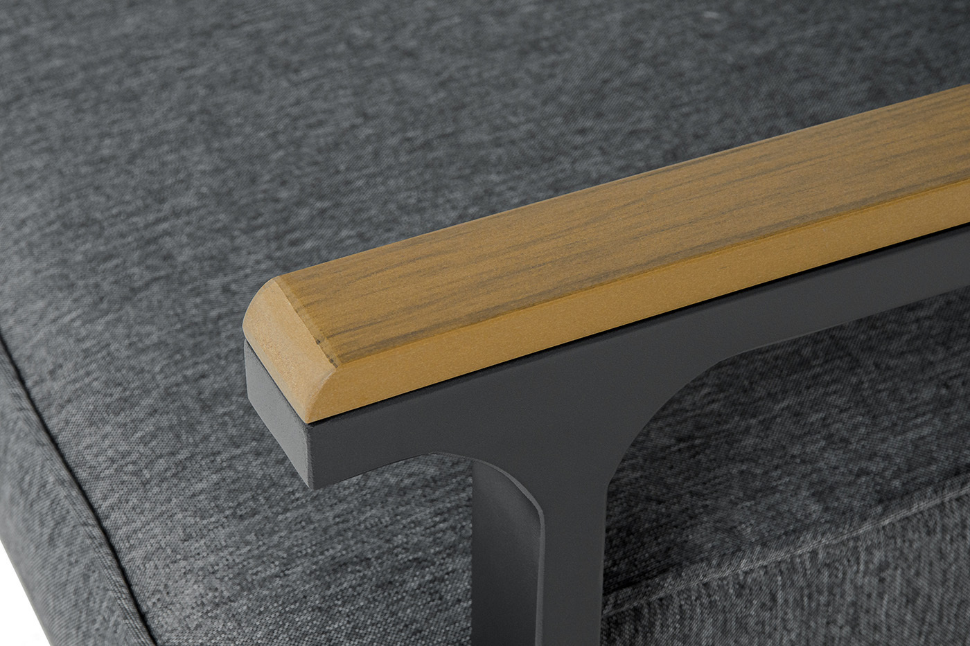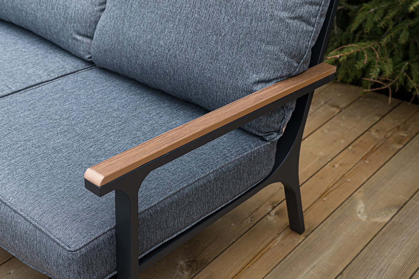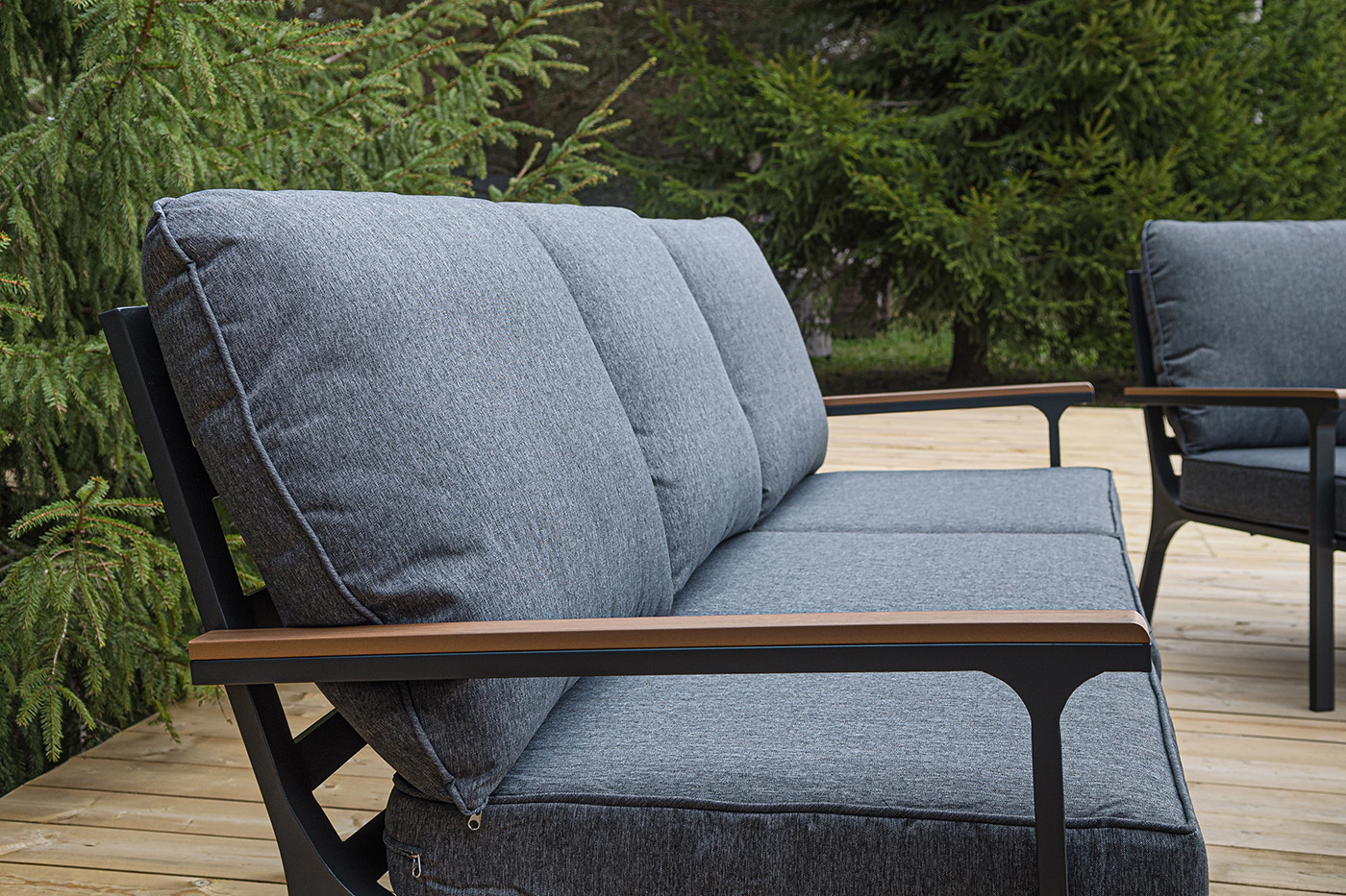 Каркас мебели выполнен из прочного алюминия темно-серого цвета. На подлокотниках дивана и двух кресел установлен облицовочный материал из древесно полимерного композита (ДПК) цвет «дерево». Крепление к каркасу осуществляется на болтах с пластиковыми заглушками темно-серого цвета, которые не ржавеют. Комплект дополняют подушки со съёмными чехлами. Материал чехлов - 100% полиэстер плотностью 190гр/м2.