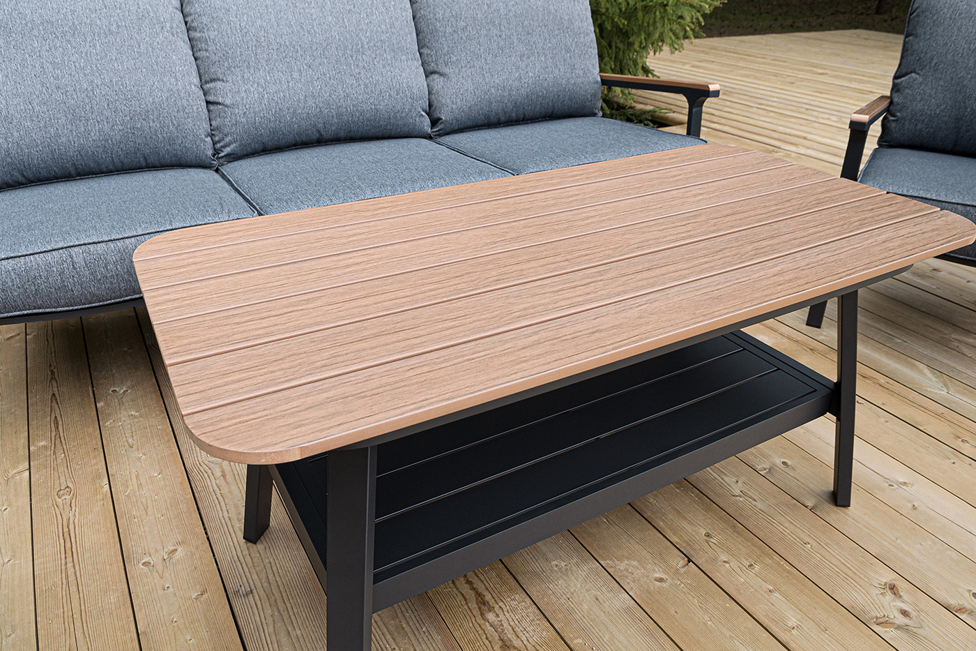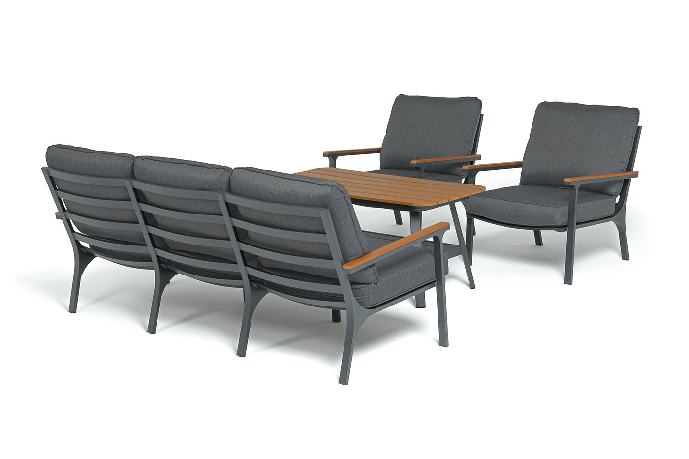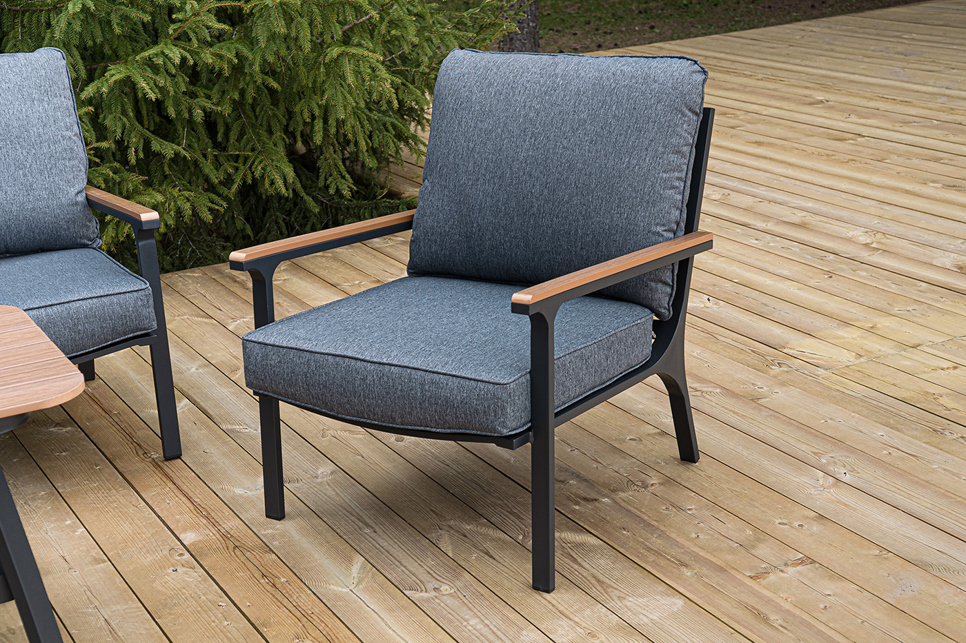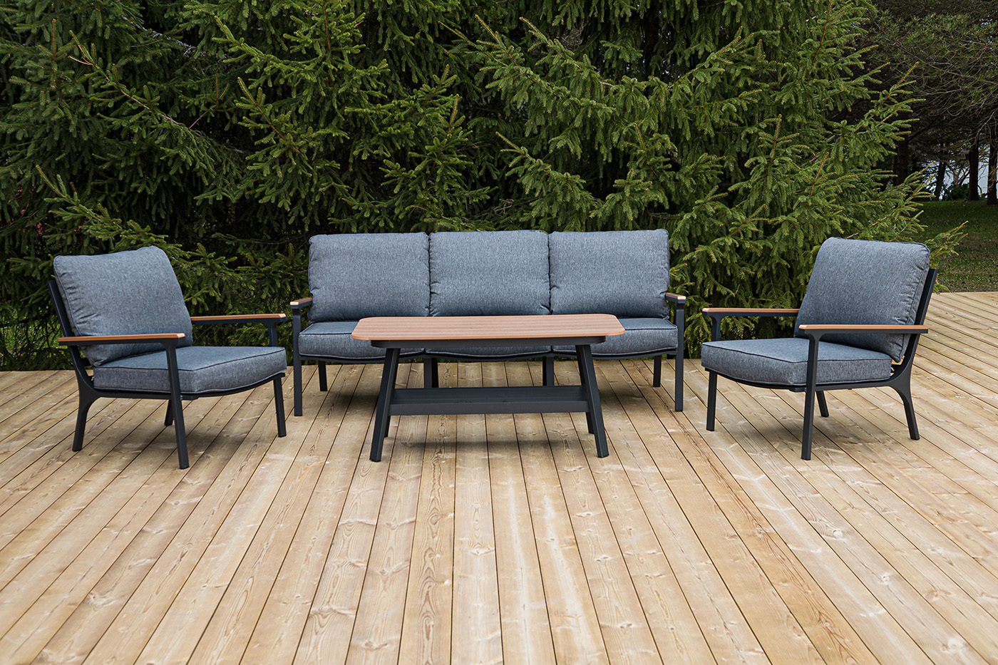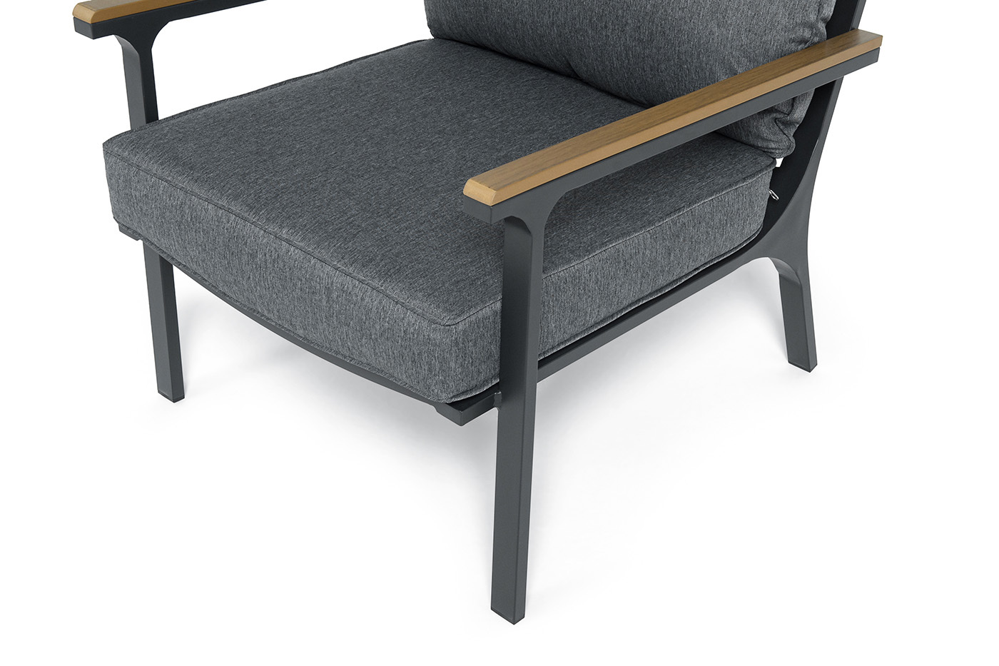 Каркас мебели выполнен из прочного алюминия темно-серого цвета. На подлокотниках дивана и двух кресел установлен облицовочный материал из древесно полимерного композита (ДПК) цвет «дерево». Крепление к каркасу осуществляется на болтах с пластиковыми заглушками темно-серого цвета, которые не ржавеют. Комплект дополняют подушки со съёмными чехлами. Материал чехлов - 100% полиэстер плотностью 190гр/м2.