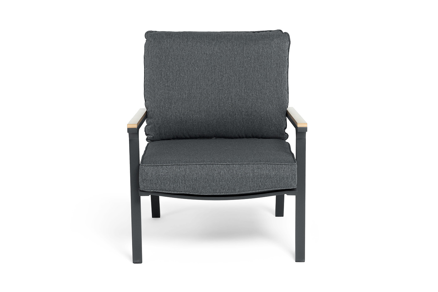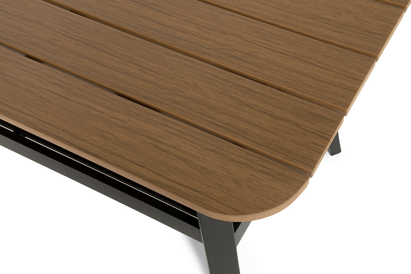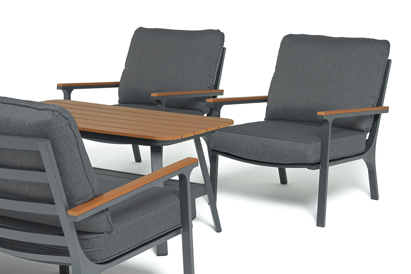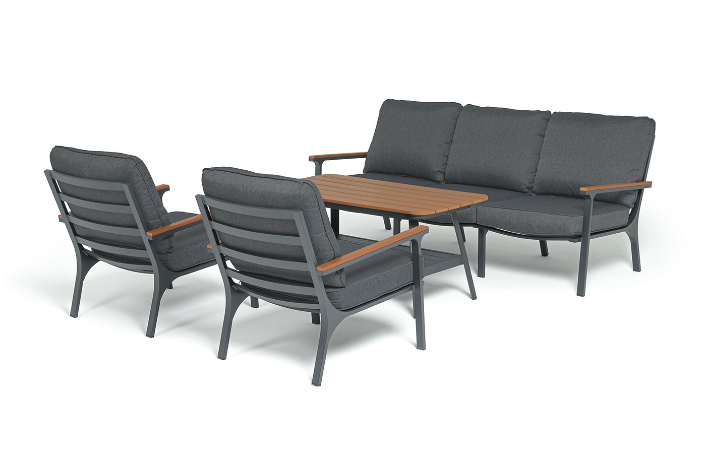 Каркас мебели выполнен из прочного алюминия темно-серого цвета. На подлокотниках дивана и двух кресел установлен облицовочный материал из древесно полимерного композита (ДПК) цвет «дерево». Крепление к каркасу осуществляется на болтах с пластиковыми заглушками темно-серого цвета, которые не ржавеют. Комплект дополняют подушки со съёмными чехлами. Материал чехлов - 100% полиэстер плотностью 190гр/м2.