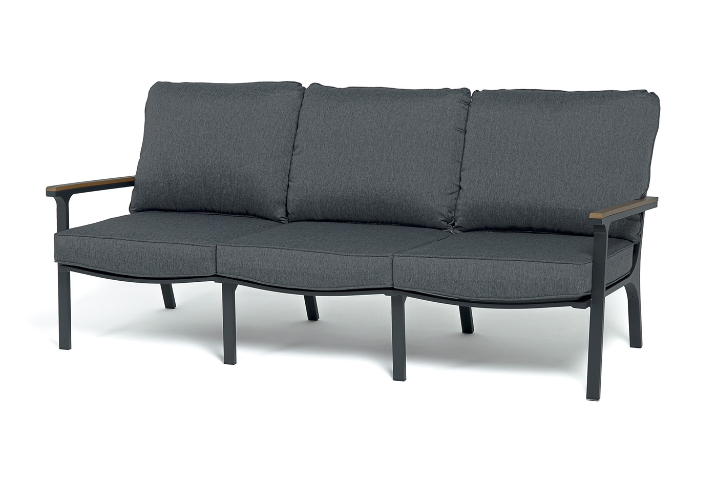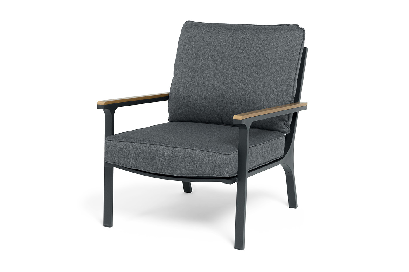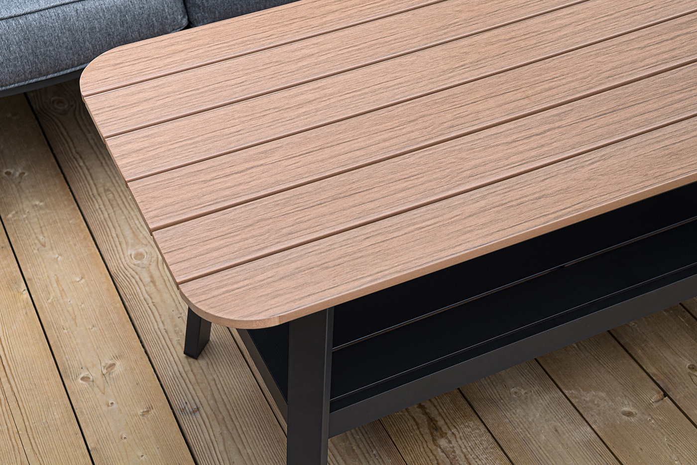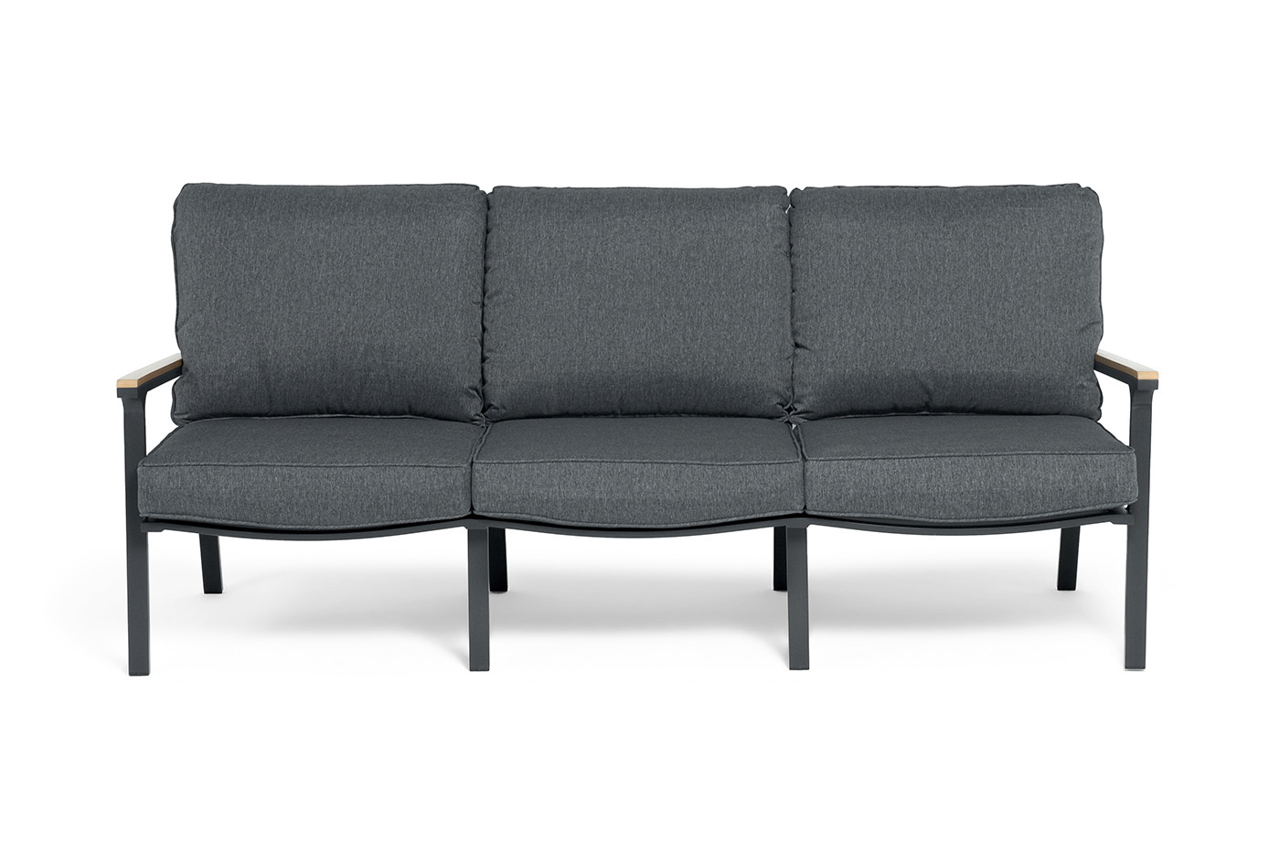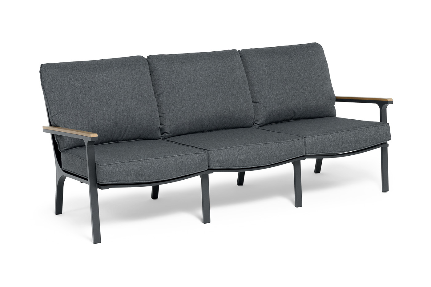 Каркас мебели выполнен из прочного алюминия темно-серого цвета. На подлокотниках дивана и двух кресел установлен облицовочный материал из древесно полимерного композита (ДПК) цвет «дерево». Крепление к каркасу осуществляется на болтах с пластиковыми заглушками темно-серого цвета, которые не ржавеют. Комплект дополняют подушки со съёмными чехлами. Материал чехлов - 100% полиэстер плотностью 190гр/м2.