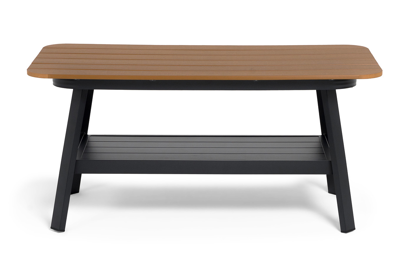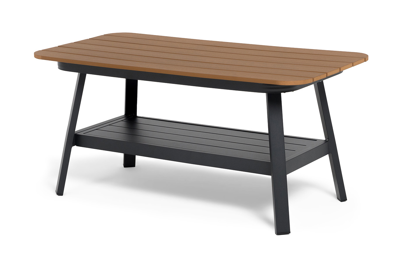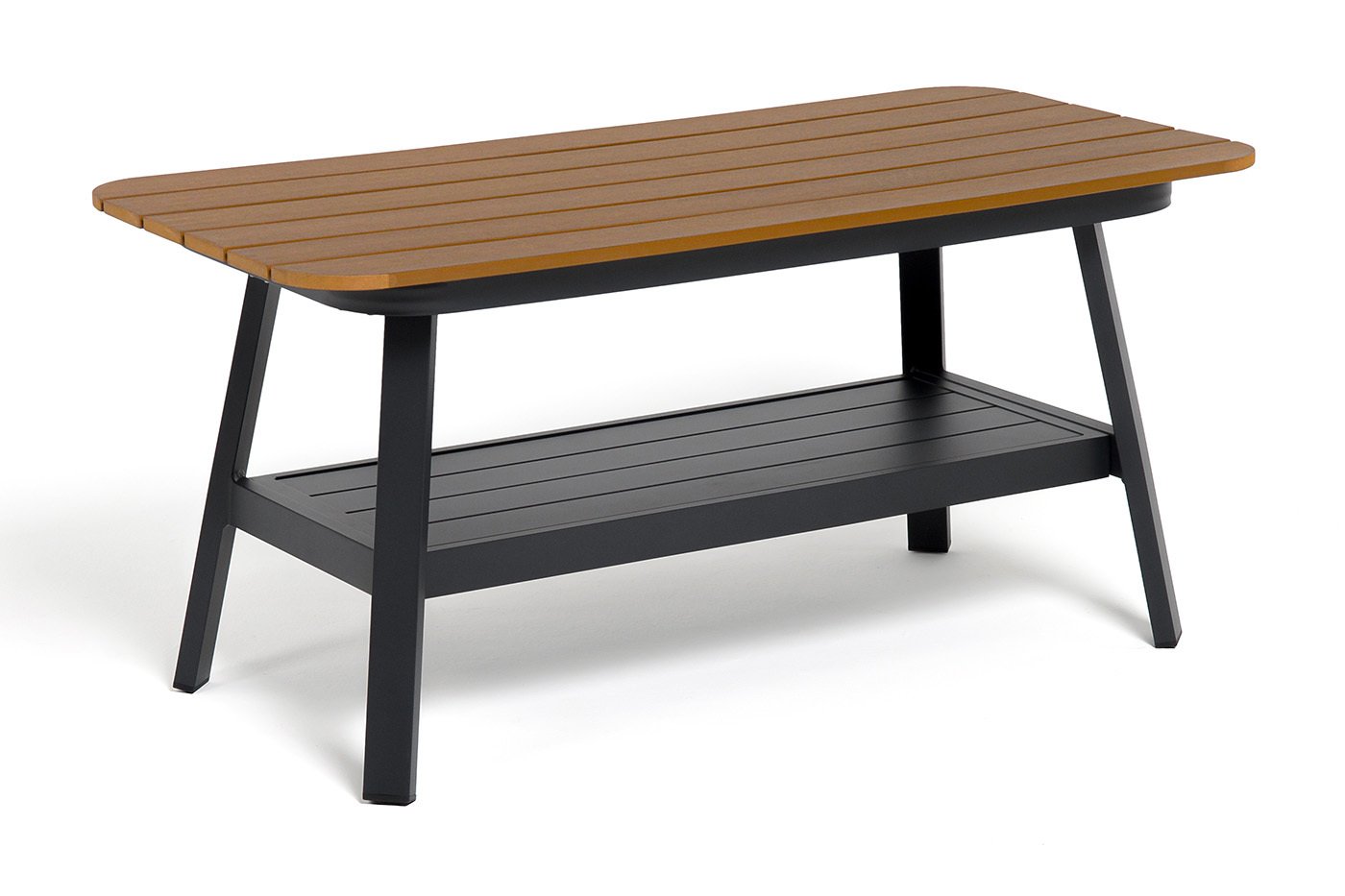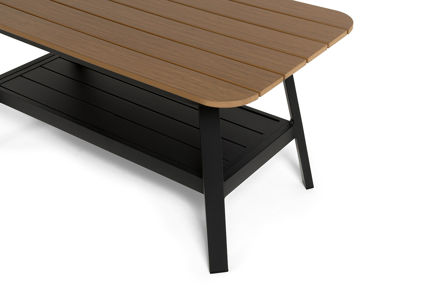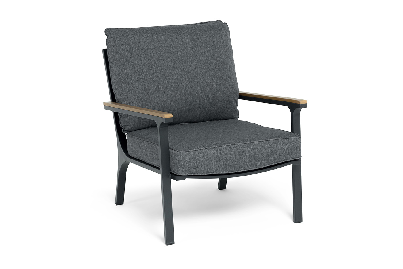 Каркас мебели выполнен из прочного алюминия темно-серого цвета. На подлокотниках дивана и двух кресел установлен облицовочный материал из древесно полимерного композита (ДПК) цвет «дерево». Крепление к каркасу осуществляется на болтах с пластиковыми заглушками темно-серого цвета, которые не ржавеют. Комплект дополняют подушки со съёмными чехлами. Материал чехлов - 100% полиэстер плотностью 190гр/м2.