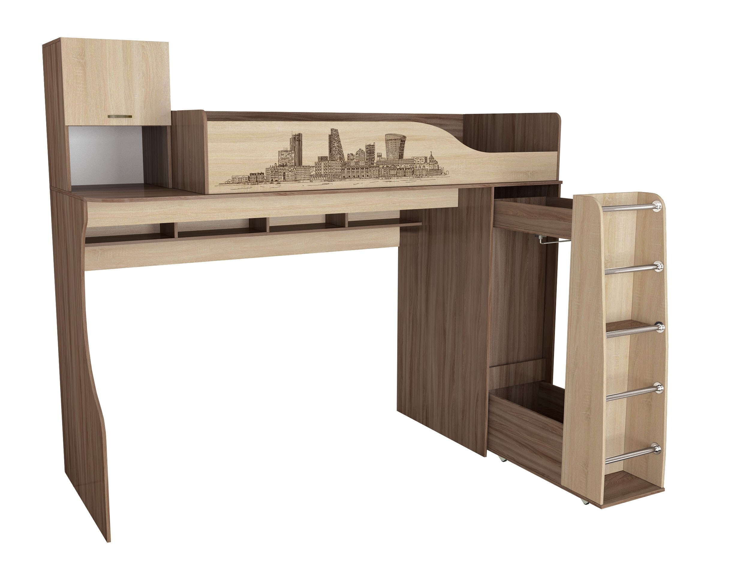 - Широкий выбор модулей: функциональные кровать-чердак и односпальная кровать, прикроватная тумба, разнообразие вместительных шкафов, угловое завершение, комод, навесная секция, письменный стол и стол с надстройкой.