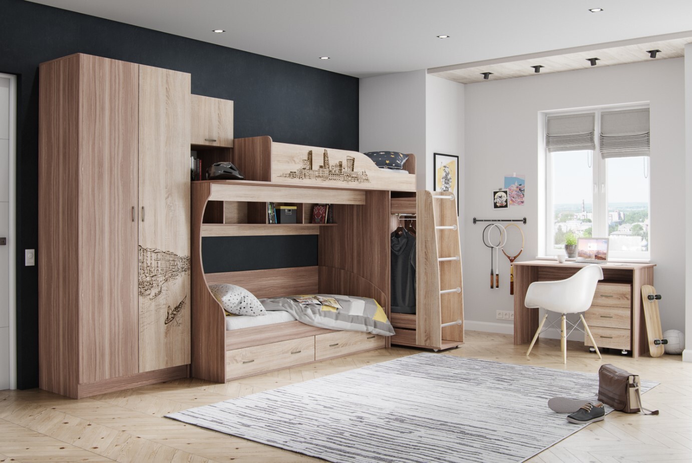 - Классические цвета исполнения Ясень шимо/Дуб Сонома в сочетании с дизайнерскими изображениями городов мира,