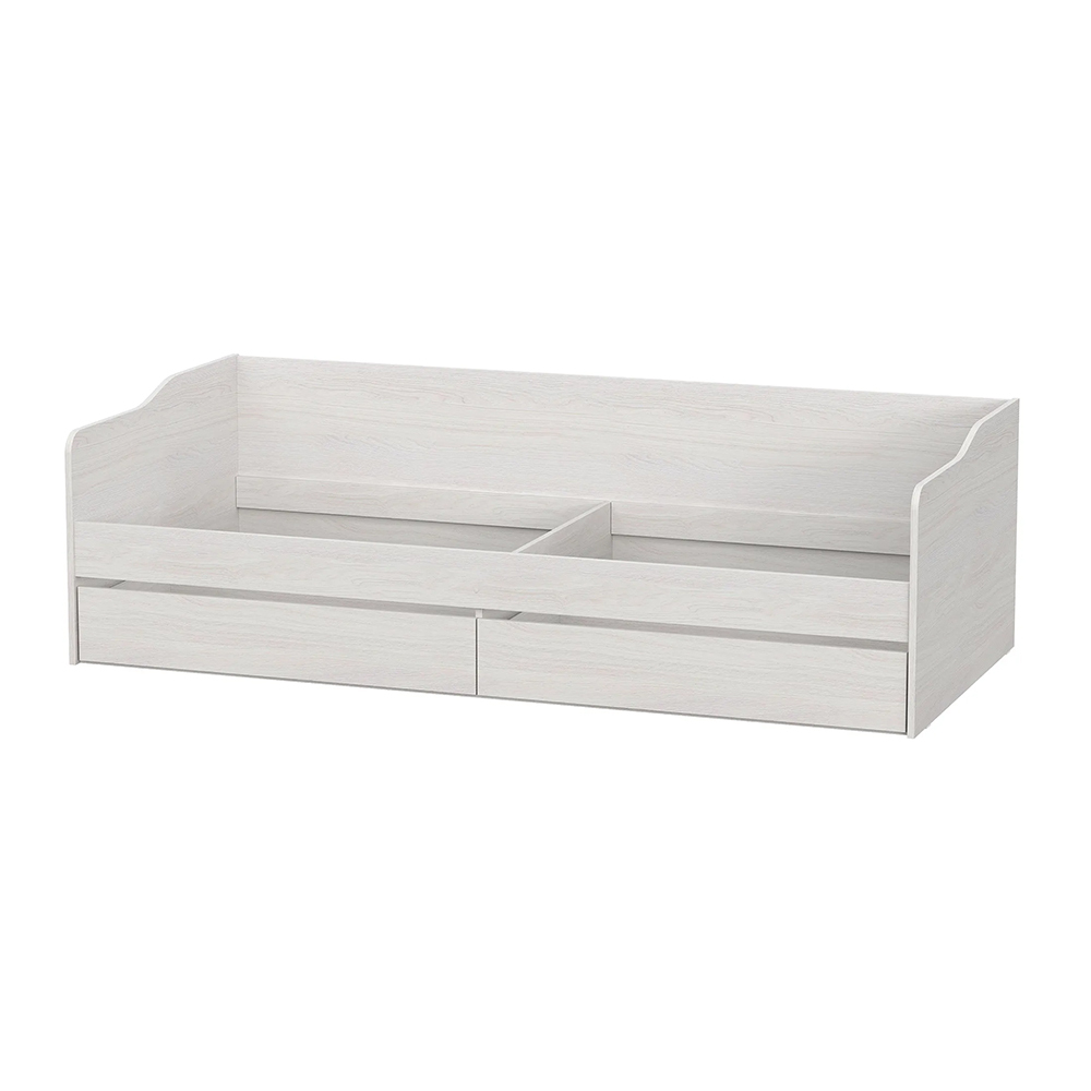 Надежная односпальная кровать из ЛДСП с ящиками. Выполнена в приятном древесном декоре "ясень анкор светлый". Два выкатных ящика подойдут для хранения постельного белья и личных вещей ребенка.