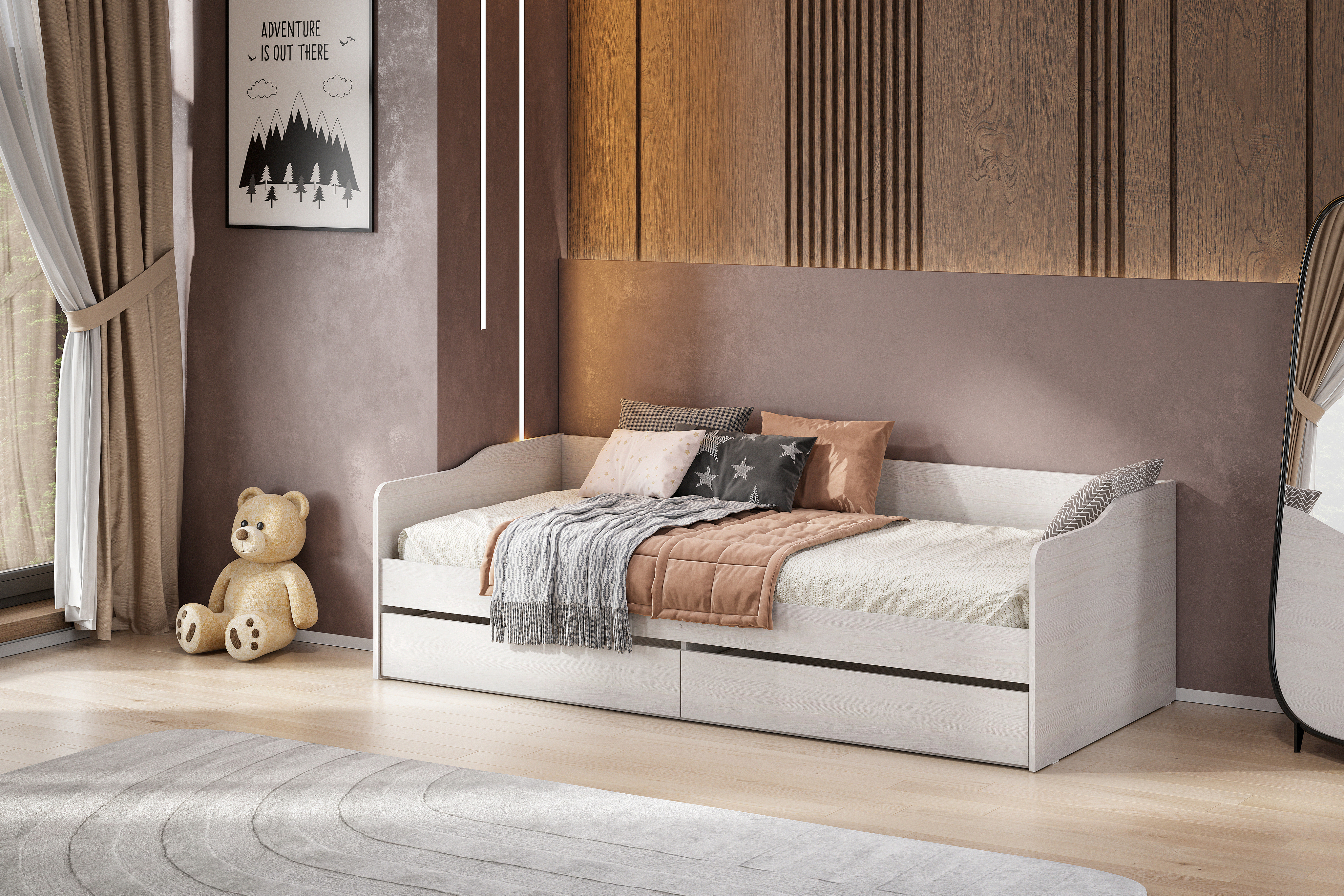 Надежная односпальная кровать из ЛДСП с ящиками. Выполнена в приятном древесном декоре "ясень анкор светлый". Два выкатных ящика подойдут для хранения постельного белья и личных вещей ребенка.