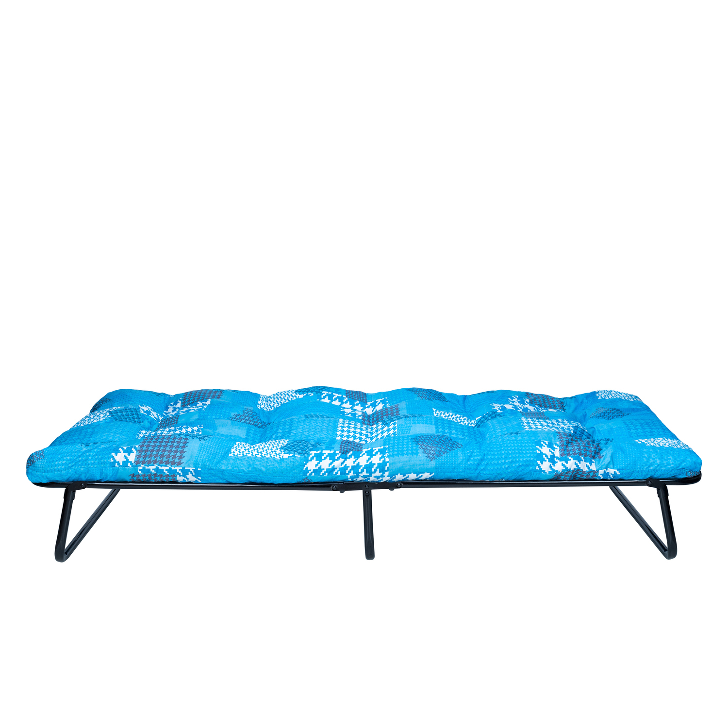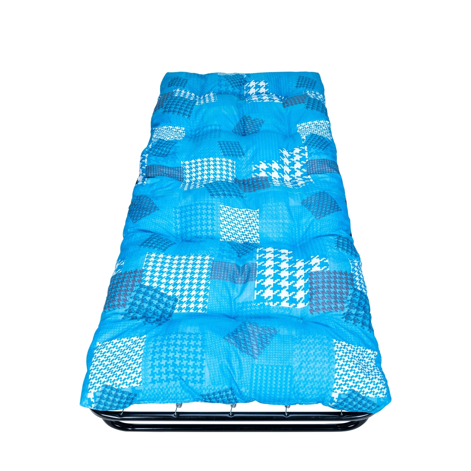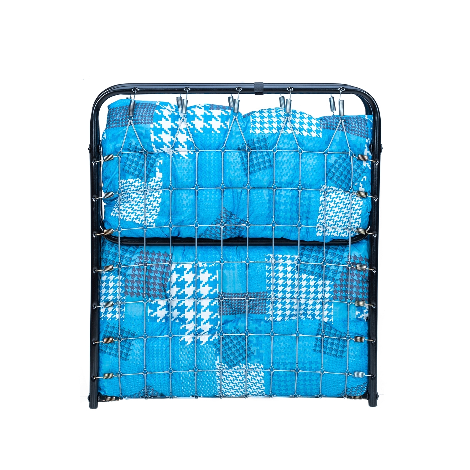 Раскладная кровать модель 202, имеет мягкий, пышный матрас, с наполнением из поролоновой кроши, толщиной 100 мм. Основание кровати – оцинкованная сетка, диаметр стальных труб каркаса 25 мм., благодаря чему кровать выдерживает нагрузку до 150 кг.