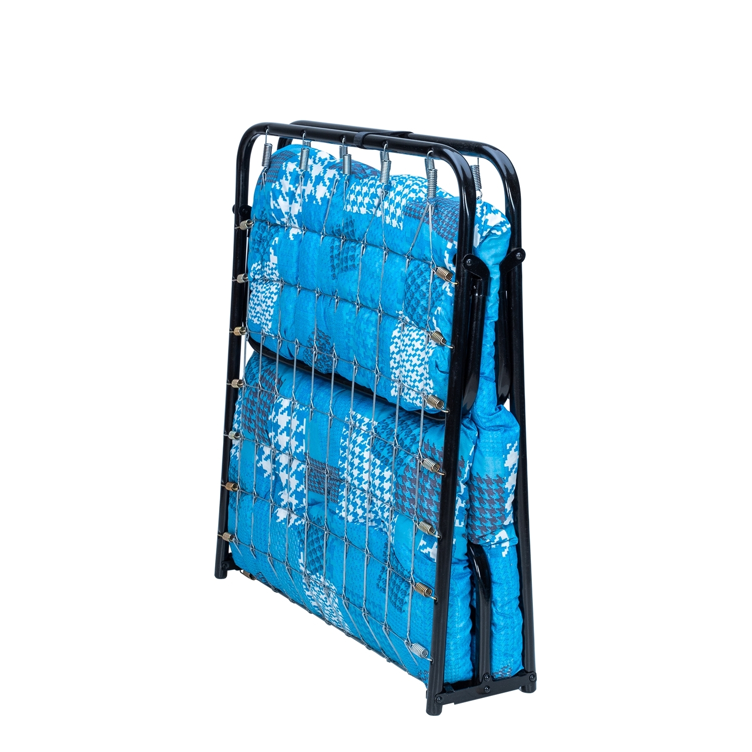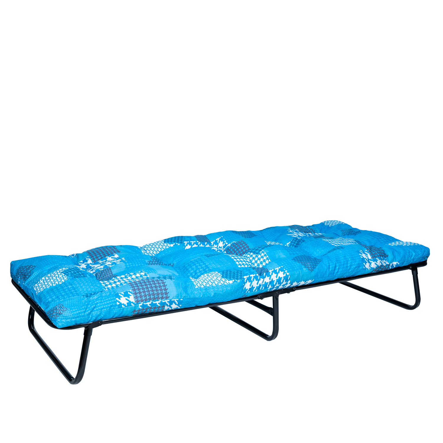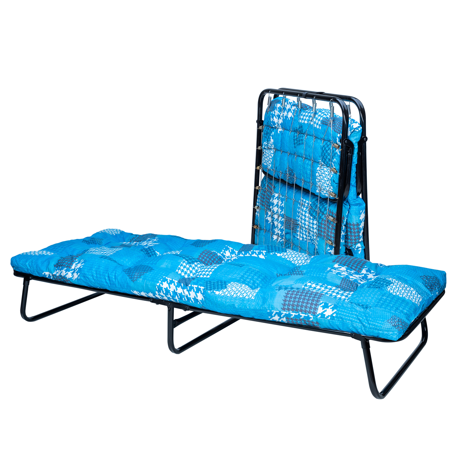 Раскладная кровать модель 202, имеет мягкий, пышный матрас, с наполнением из поролоновой кроши, толщиной 100 мм. Основание кровати – оцинкованная сетка, диаметр стальных труб каркаса 25 мм., благодаря чему кровать выдерживает нагрузку до 150 кг.