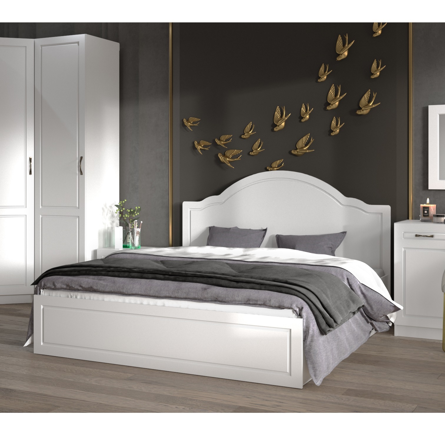 Отличительной чертой двухспальной кровати Апполия выступают фрезерованные изголовье и изножье. В комплекте идет основание из ЛДСП.