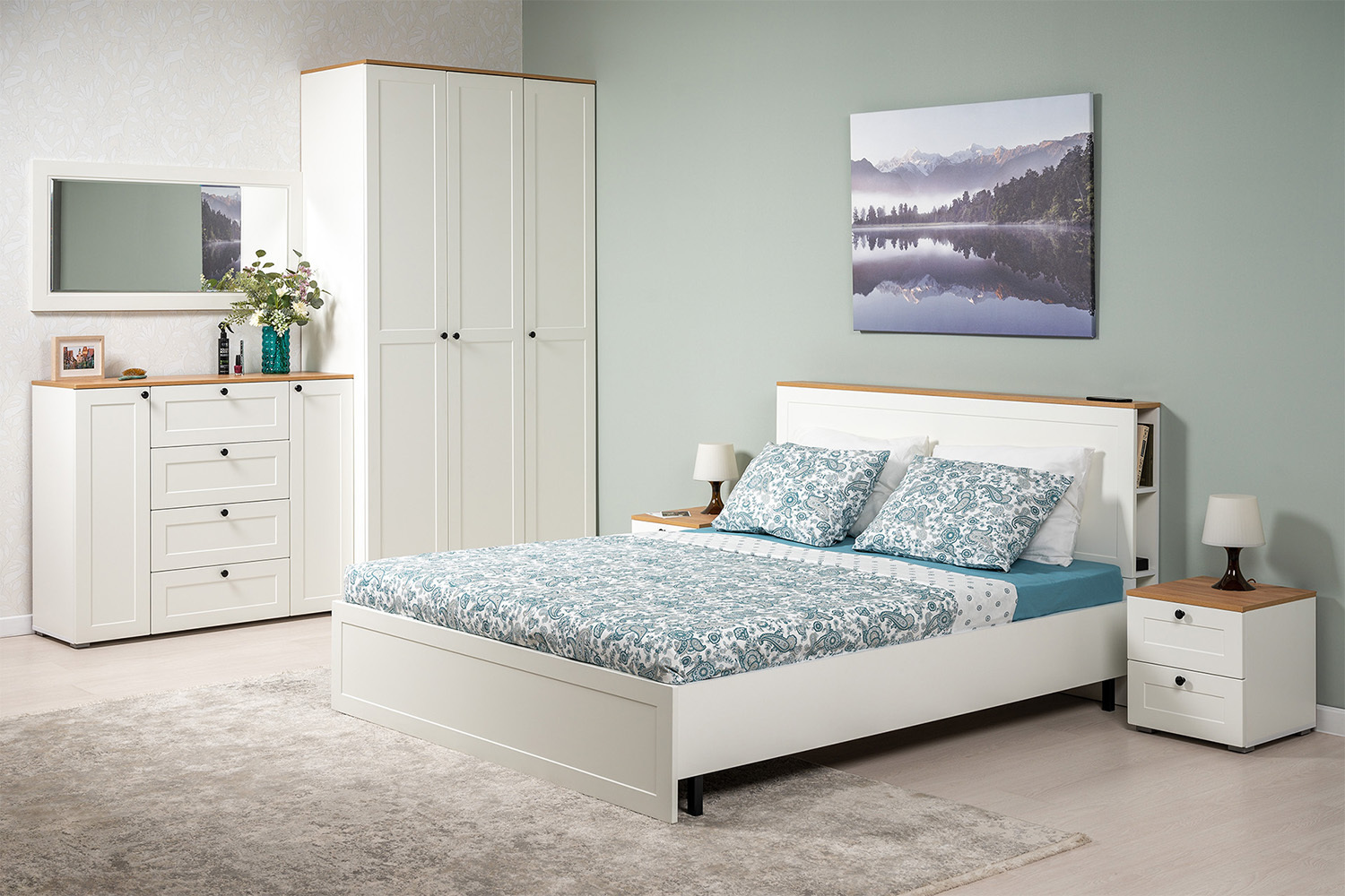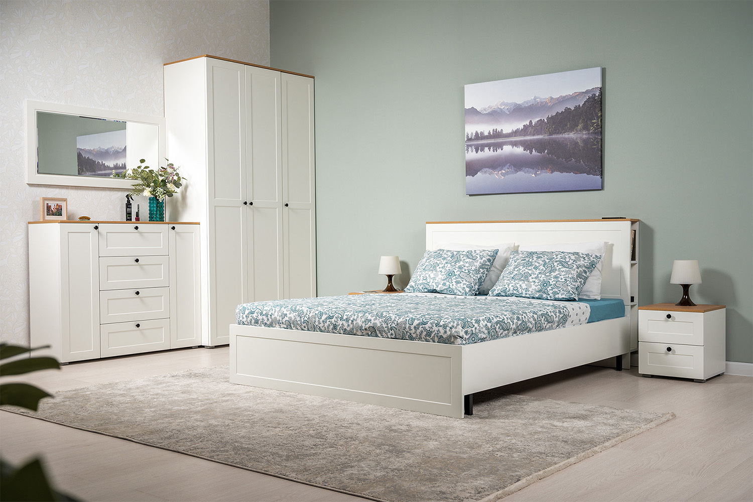 В изголовье кровати предусмотрены вместительные ниши. Шкафная группа полноценной глубины позволяет эффективно организовать систему хранения.