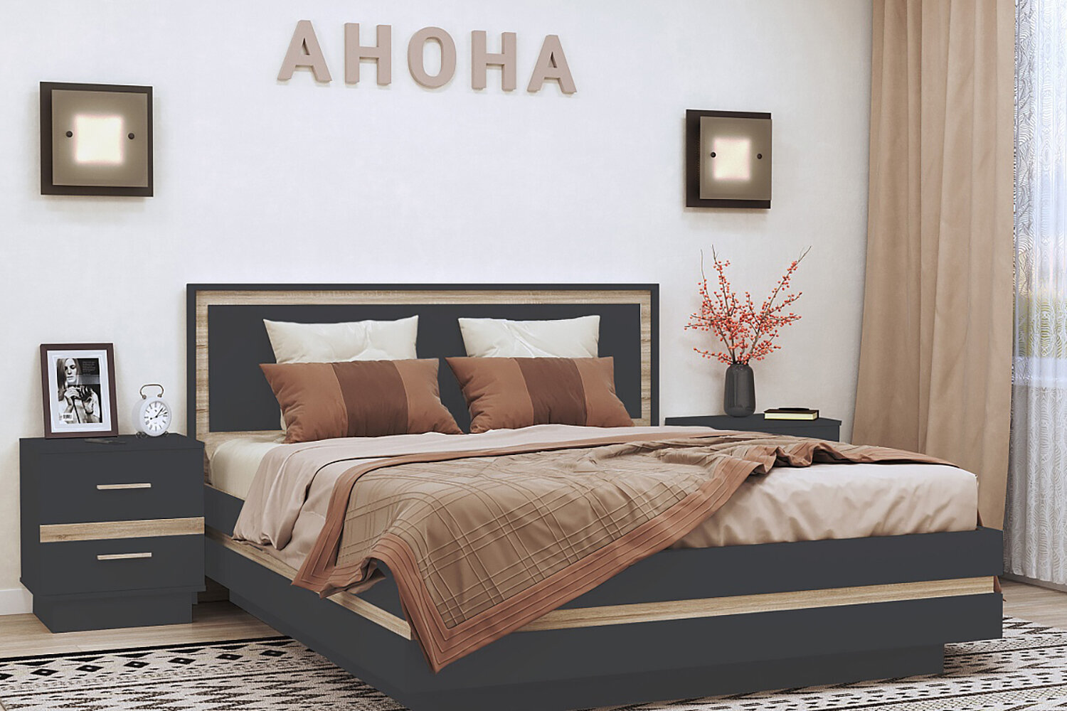 Двуспальная кровать из серии Анона в стильном цвете антрацит с декоративными вставками дуб сонома по основанию и на изголовье.