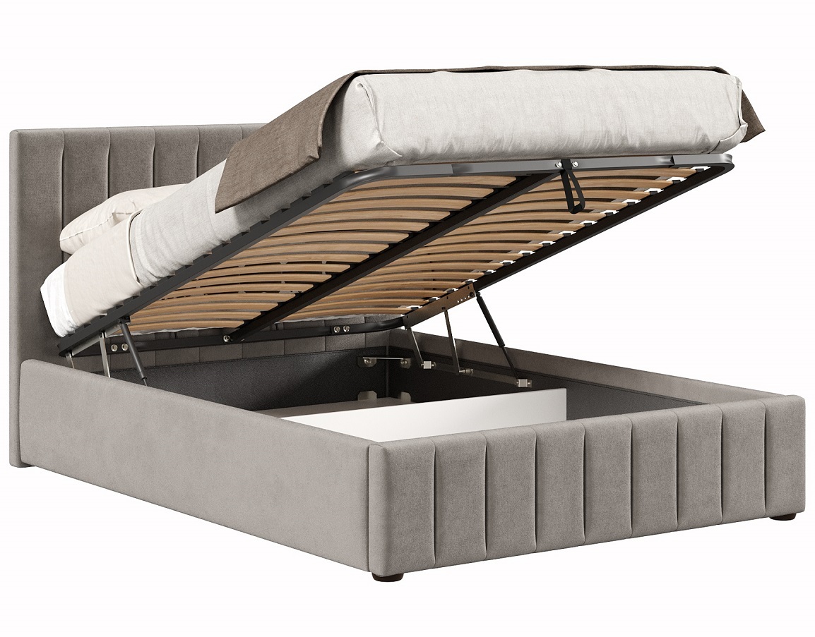 Двуспальная кровать с подъёмным механизмом Верона в пепельных тонах сочетает в себе эстетику сдержанной роскоши, индивидуальность и практичность. Мягкая обивка создаёт атмосферу уюта, а основание с ламелями обеспечивает комфортный сон. Особенностью этой модели является повторяющийся декор, который украшает спинку и изножье кровати. Вертикальные строчки подчёркивают симметрию и правильные линии кровати.