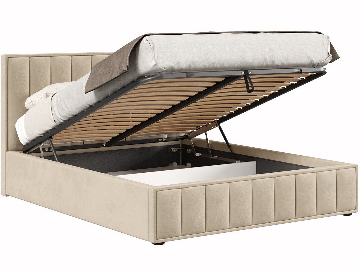 В дизайне кровати с подъёмным механизмом Анкона гармонично сочетаются элегантность, индивидуальность и практичность. Мягкая обивка создаёт атмосферу уюта. Отличительной чертой этой модели является повторяющийся узор, который присутствует на изголовье и изножье. Вертикальные строчки подчёркивают симметричность и чёткость линий кровати.
